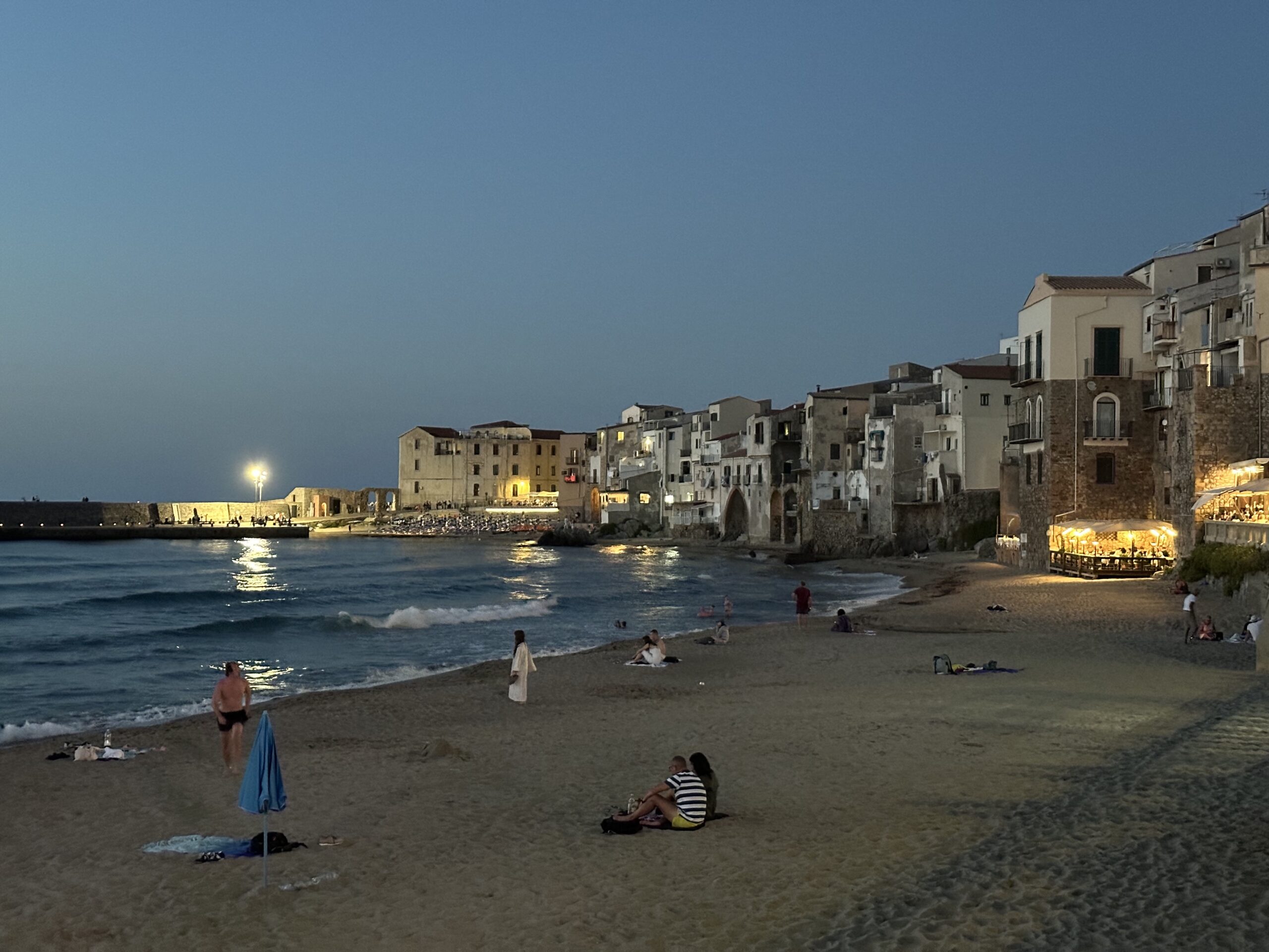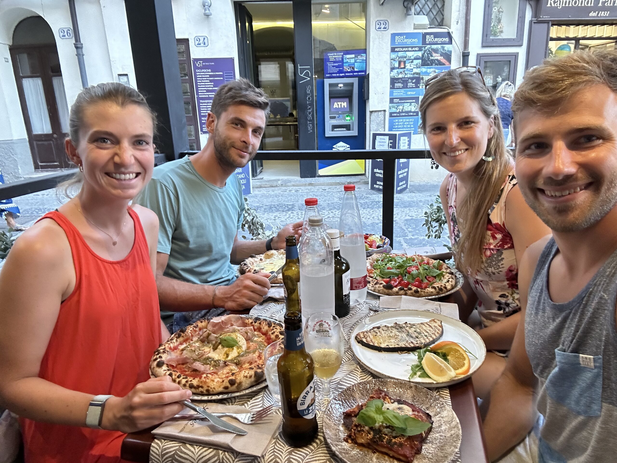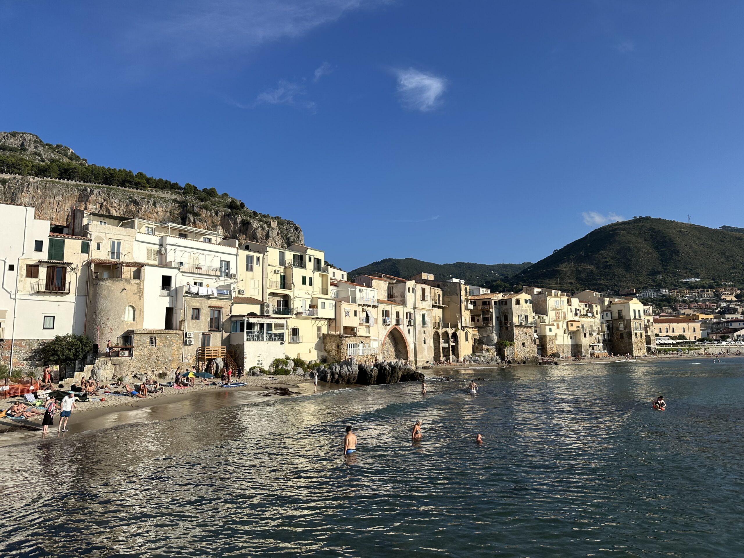 Wieder vereint essen wir am Campingplatz gemeinsam zu Mittag und nutzen die Wasser-Infrastruktur um weitere Teile unserer Surfausrüstung reinigen. Roman und Sophie waschen sogar zwei ihrer Kites. Eva und ich gehen noch ins Meer am Campingplatzstrand und genießen das erfrischende Wasser und fühlen die Kraft der Natur in Form der Brandung. Unter Umständen wird morgen tatsächlich noch das Surfbrett ausgepackt, haben wir beschlossen. Doch heute ist keine Zeit, denn wir wollen alle gemeinsam in die Stadt nebenan, namens Cefalù fahren. Eine der Hauptattraktionen Siziliens. Wir nehmen den kleinen Bus direkt vorm Campingplatz, der uns um 16:30 für 6€ hin und später auch retour bringt. Der Bus ist ziemlich eng und voll und auf unseren Stehplätzen stehend erreichen wir nach ca 20 Minuten das Stadtzentrum direkt am Meer. Uns erwartet ein dicht gefüllter Strand, neben einer kleinen Altstadt aus fast mittelalterlich wirkenden Steingebäuden. Wir spazieren zuerst an der Promenade entlang, dann durch die engen Gassen.