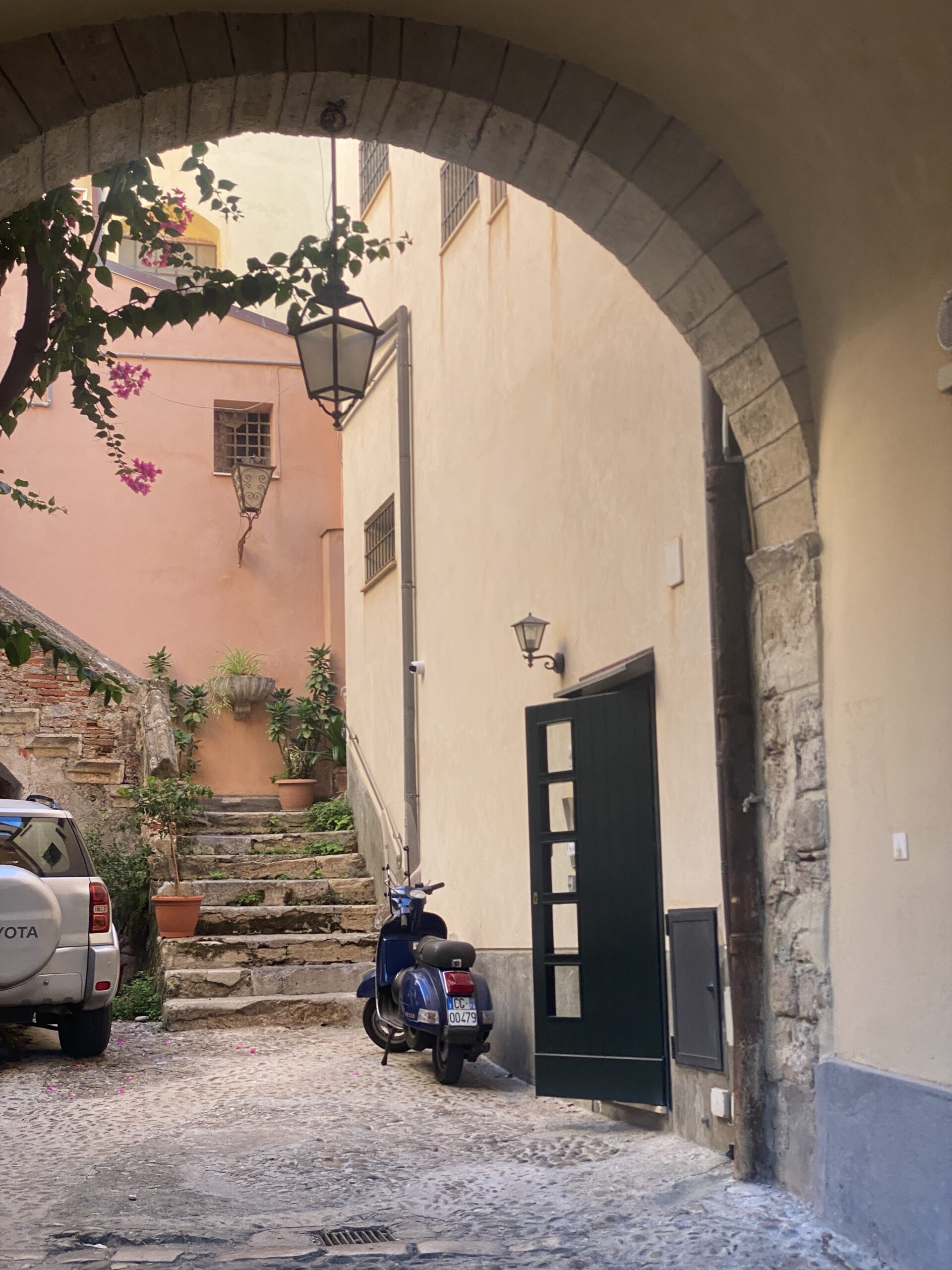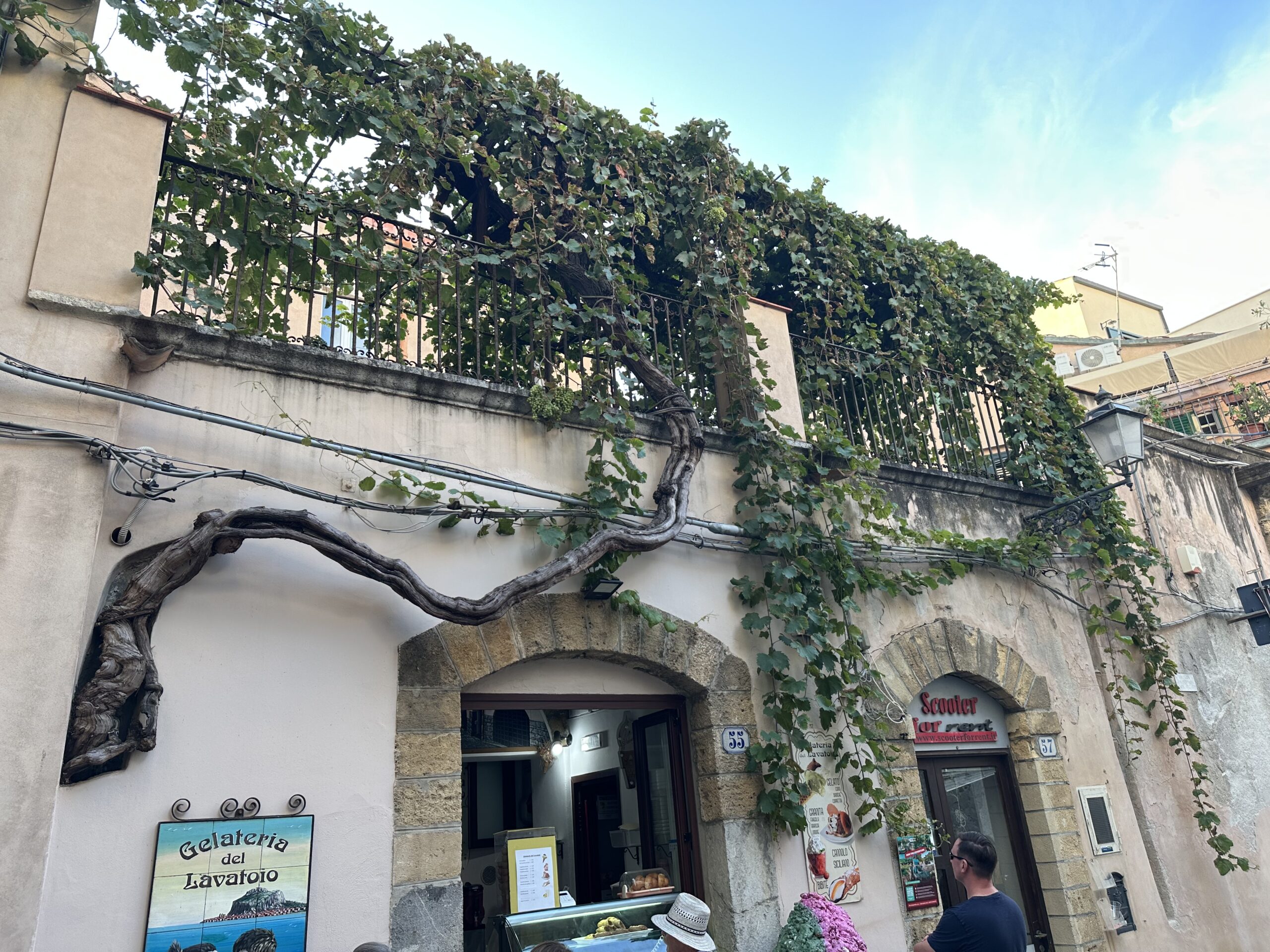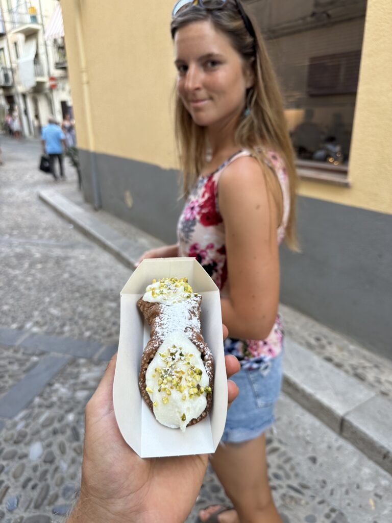 Wieder vereint essen wir am Campingplatz gemeinsam zu Mittag und nutzen die Wasser-Infrastruktur um weitere Teile unserer Surfausrüstung reinigen. Roman und Sophie waschen sogar zwei ihrer Kites. Eva und ich gehen noch ins Meer am Campingplatzstrand und genießen das erfrischende Wasser und fühlen die Kraft der Natur in Form der Brandung. Unter Umständen wird morgen tatsächlich noch das Surfbrett ausgepackt, haben wir beschlossen. Doch heute ist keine Zeit, denn wir wollen alle gemeinsam in die Stadt nebenan, namens Cefalù fahren. Eine der Hauptattraktionen Siziliens. Wir nehmen den kleinen Bus direkt vorm Campingplatz, der uns um 16:30 für 6€ hin und später auch retour bringt. Der Bus ist ziemlich eng und voll und auf unseren Stehplätzen stehend erreichen wir nach ca 20 Minuten das Stadtzentrum direkt am Meer. Uns erwartet ein dicht gefüllter Strand, neben einer kleinen Altstadt aus fast mittelalterlich wirkenden Steingebäuden. Wir spazieren zuerst an der Promenade entlang, dann durch die engen Gassen.