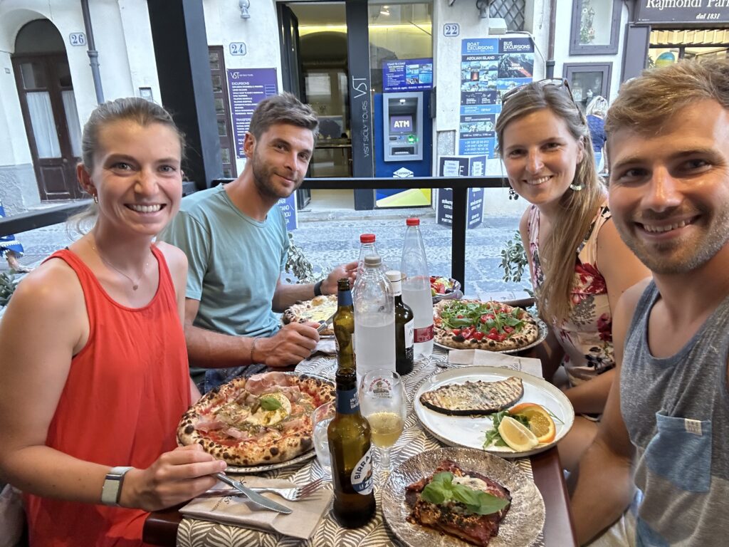 Roman stößt frisch geschoren wieder zu uns und wir steuer ein zuvor bereits begutachtetes Restaurant an. Meine drei Reisebegleiter bleiben dem Pizzakonsum treu, ich hingegen bestelle mir Schwertfisch mit Melanzani Parmegiano. Es war nicht billig, aber sehr gut.
