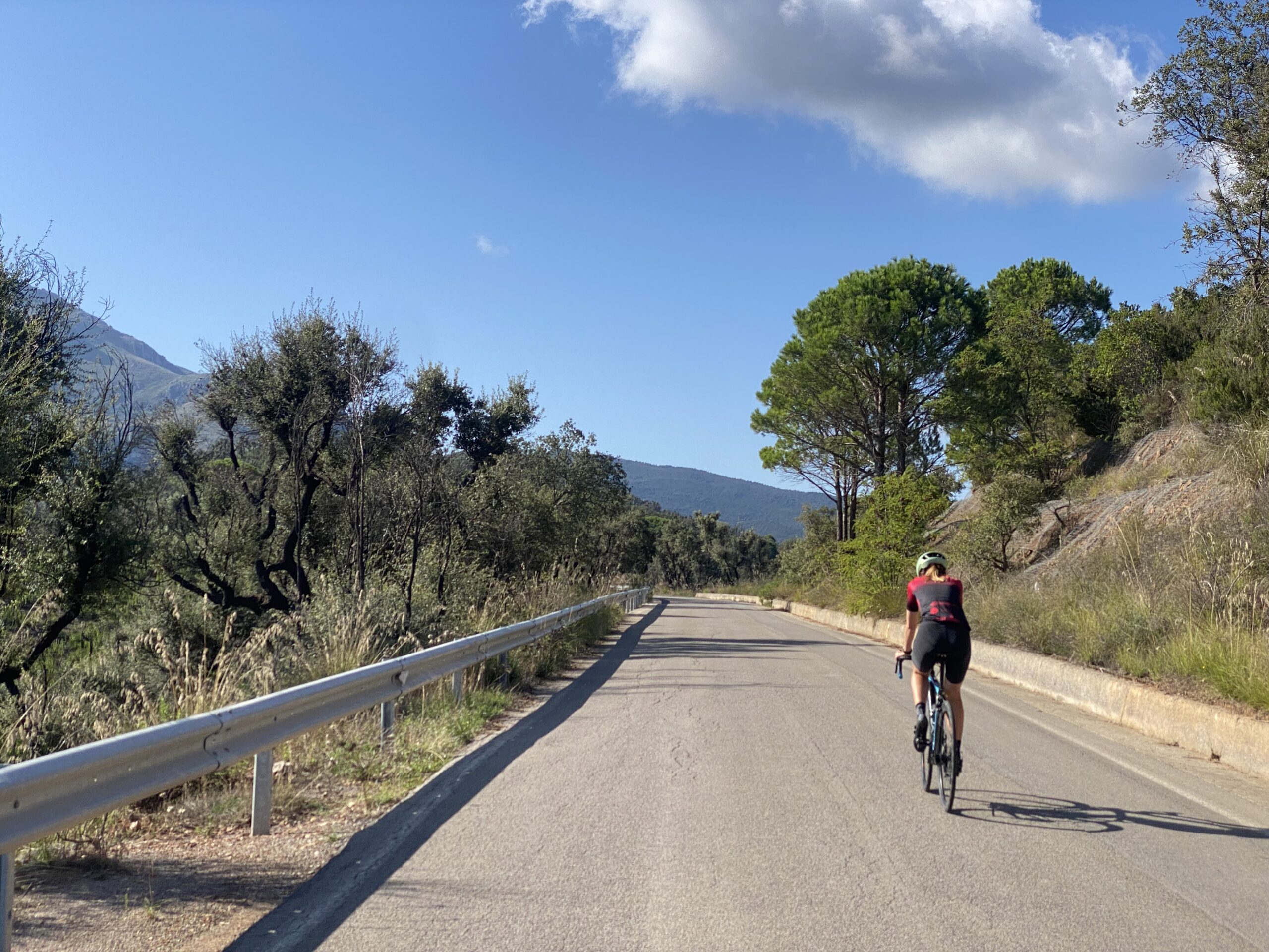 Gerade als mir die Bergabfahrt richtig zu taugen anfängt, rutscht mein Rad aus mir im Nachhinein nicht wirklich erklärbaren Gründen weg und ich lieg auf der Straße. Es war bei mäßigem Tempo und bis auf kleine Schürfer ist mir und dem Rad nichts passiert. Aber ich ärgere mich über den zweiten Sturz innerhalb so kurzer Zeit. Den Rest der Abfahrt fahre ich nun richtig vorsichtig. Kurz durchqueren wir beim Heimfahren die Stadt Cefalù mit ihrem Strand – es schaut sehr lieblich aus und wir freuen uns schon auf den geplanten Abend dort. Nun heim zu Luki und zu einem Bad im Meer.