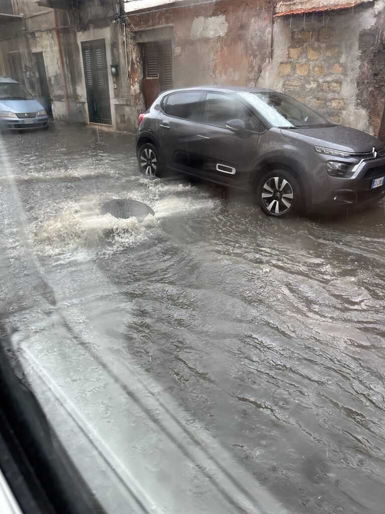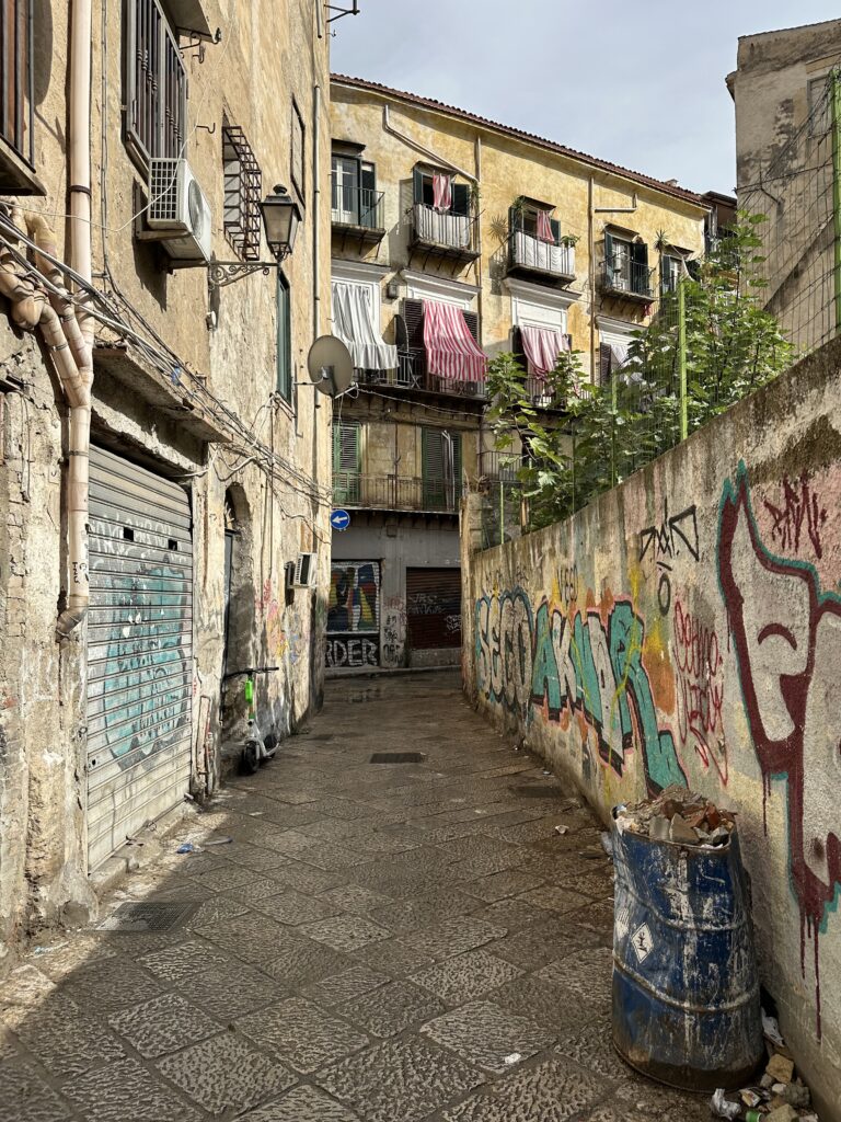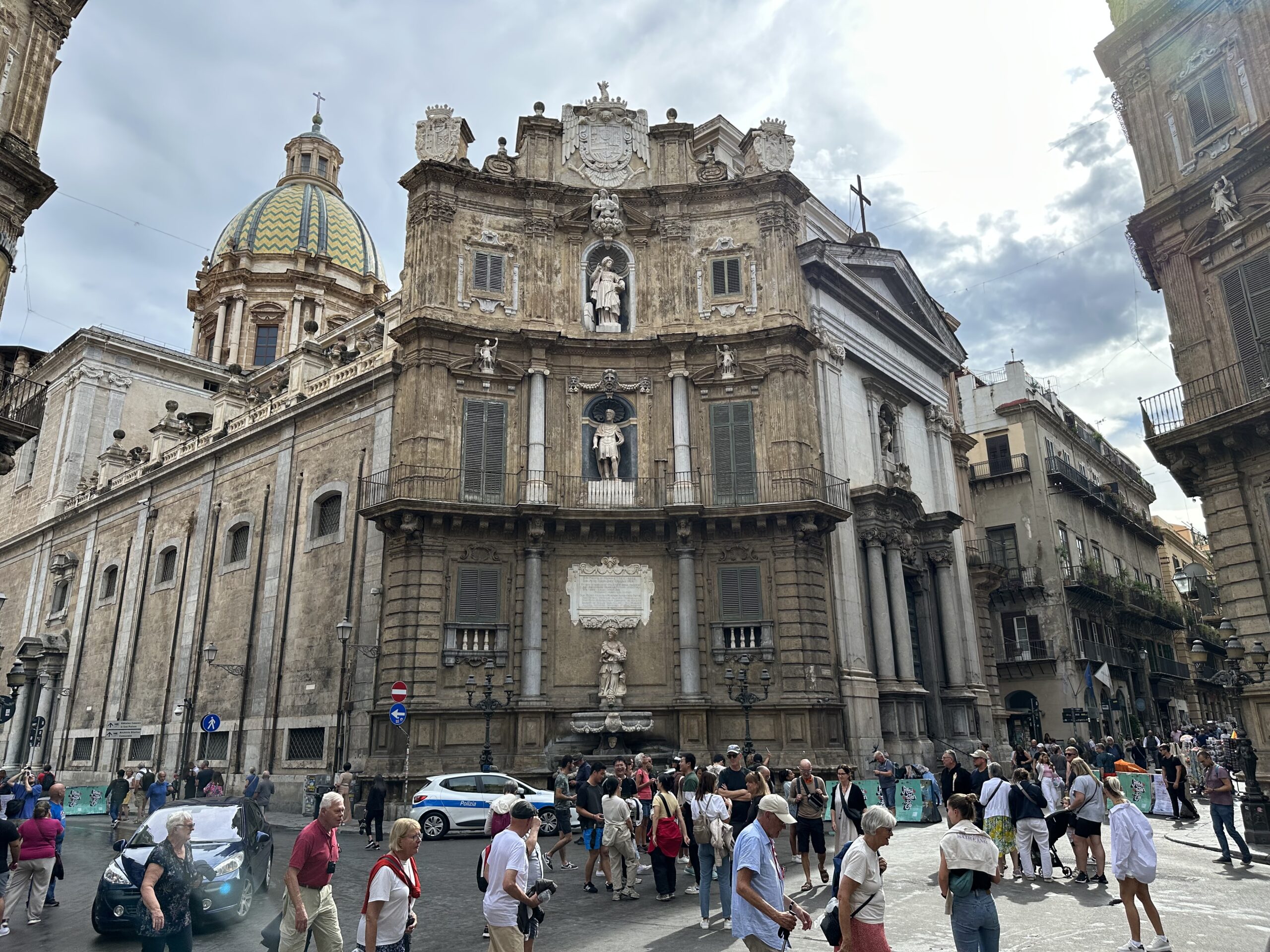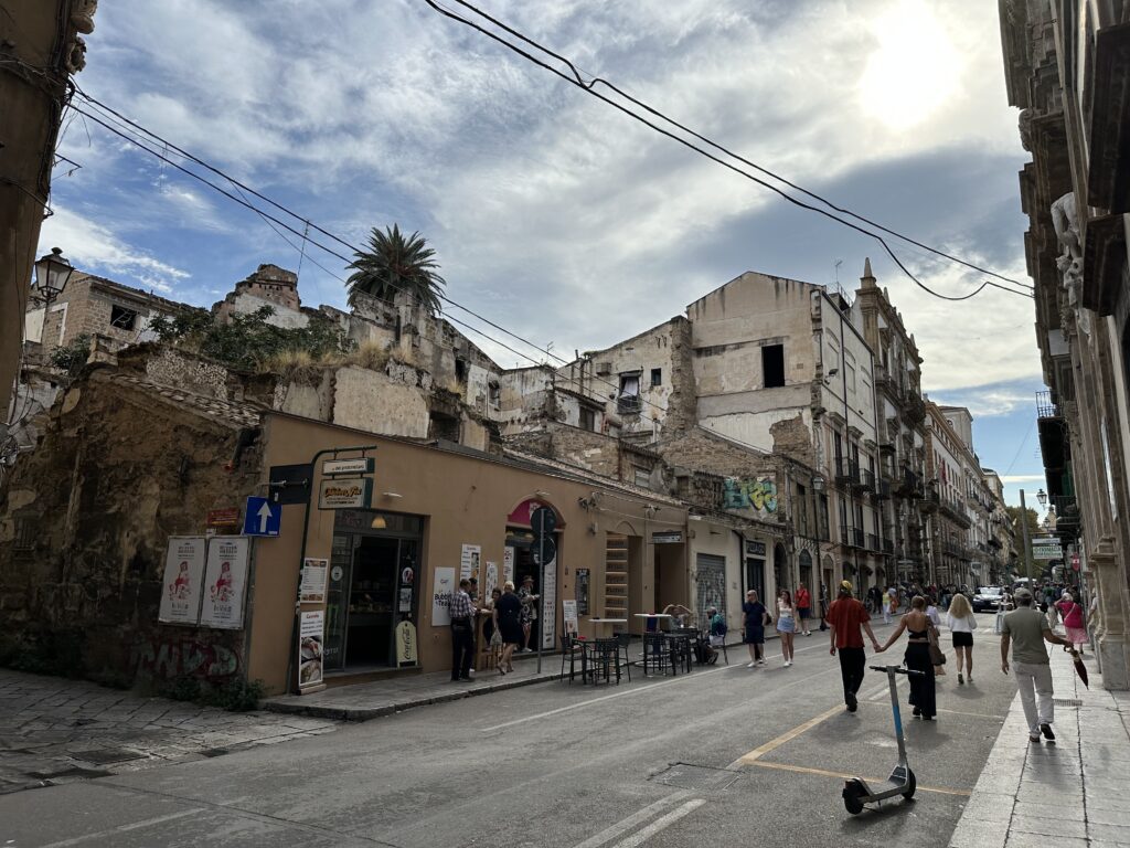 Dort genießen wir ein abschließendes Bad im Meer und danach eine Süßwasserdusche, ehe wir unser Camp abbrechen und um 12:00 auschecken. Wir zahlen gesamt 50€, also 25€ pro Nacht, was für den privaten Meerzugang und außerordentlich gepflegten Campingplatz eigentlich wirklich gut ist. Danach nehmen wir die Autobahn nach Palermo. Dort wird heute Abend unsere Fähre nach Genua abfahren und so haben wir davor noch etwas Zeit für eine Stadtbesichtigung. Wir sollten etwa eine Stunde Fahrzeit haben bis zu einem bewachten Parkplatz, den wir uns rausgesucht haben. Doch am Weg fängt es bereits zu regnen an. In Palermo angekommen realisieren wir, dass hier ein ziemliches Verkehrschaos herrscht. Ob das immer so ist, oder wegen dem Regen und den damit einhergehenden überfluteten Straßen und der übergehenden Kanalisation, wissen wir nicht. Vermutlich ist es aber immer so. In italienischer Manier wird viel geschimpft, gestikuliert und gehupt, aber dennoch springen sich die Leute nicht a den Kragen, so wie es bei uns zuhause eher der Fall ist. Nachdem wir wohl eine halbe Stunde im Stau gesteckt sind, erreichen wir den angestrebten Parkplatz. Dort stellt sich leider heraus, dass dieser voll ist und so müssen wir weiter in bzw. durch die Stadt, zu einer Alternative im Hafen. Immerhin sind wir dann später bereits näher am Pier, an dem die Fähre ablegen wird. Wir kämpfen uns durch enge Gassen und weichen herausgedrückten Kanaldeckeln aus. Ein leichter Fäkalgeruch liegt auch in der Luft.