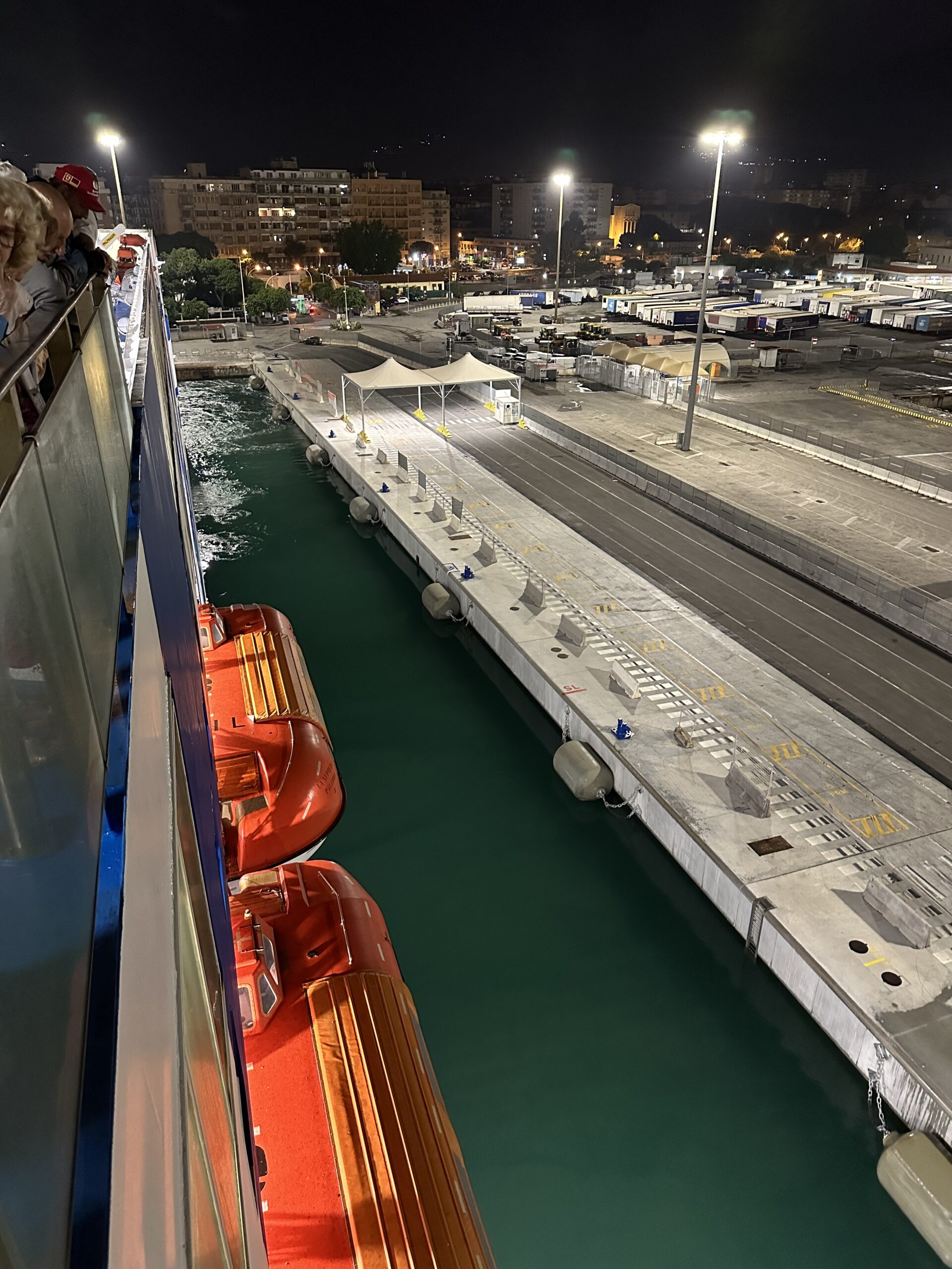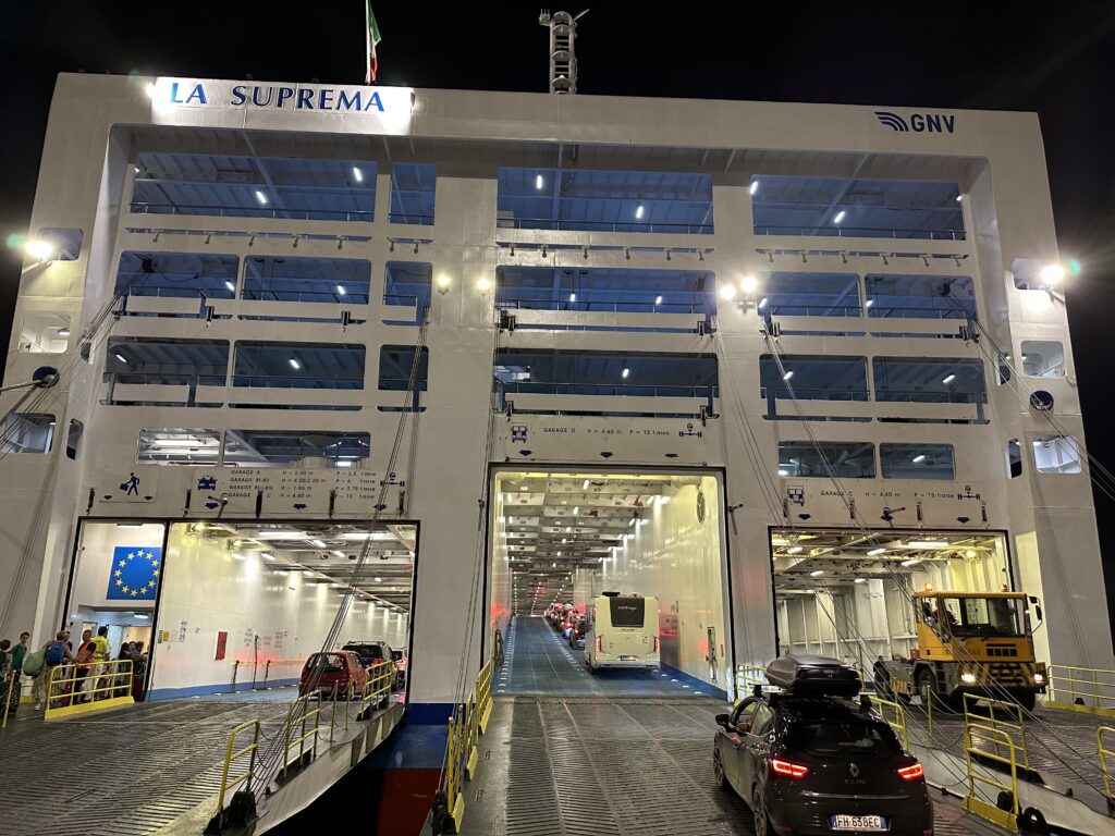Am Rückweg stoppen wir in einer Pizzeria in der Restaurantmeile, wo ich mir mit Eva eine leckere Pizza mit frischen roten und gelben Tomaten halbiere. Danach teilen wir uns auch eines der berühmten Cannoli (Süßspeise) bei einer 1041 gegründeten Cannoli-Bäckerei. Die Dunkelheit bricht schon herein und wir haben wohl das meiste, das Palermo zu bieten hat, nun gesehen und steuern so in Richtung Hafen und Parkplatz zurück. Dort angekommen packen wir unserere Rucksäcke und eine Essenskiste um die Nacht und einen Tag auf der Fähre gut zu überstehen, nachdem wir während der Fahrt nicht zum Auto dürfen um etwas zu holen. Im Anschluss fahren wir etwa 1,5h vor geplanter Abfahrt zum Dock und stellen uns bei der bereits beträchtlichen Schlange an Autos an. Die Fähre von GNV, mit dem Namen „La Suprema“ überrascht uns mit ihrer Dimension absolut. Fast schon wie ein großes Kreuzfahrtsschiff mit 9 Stockwerken und 211m Länge ragt sie am Pier vor uns auf.
