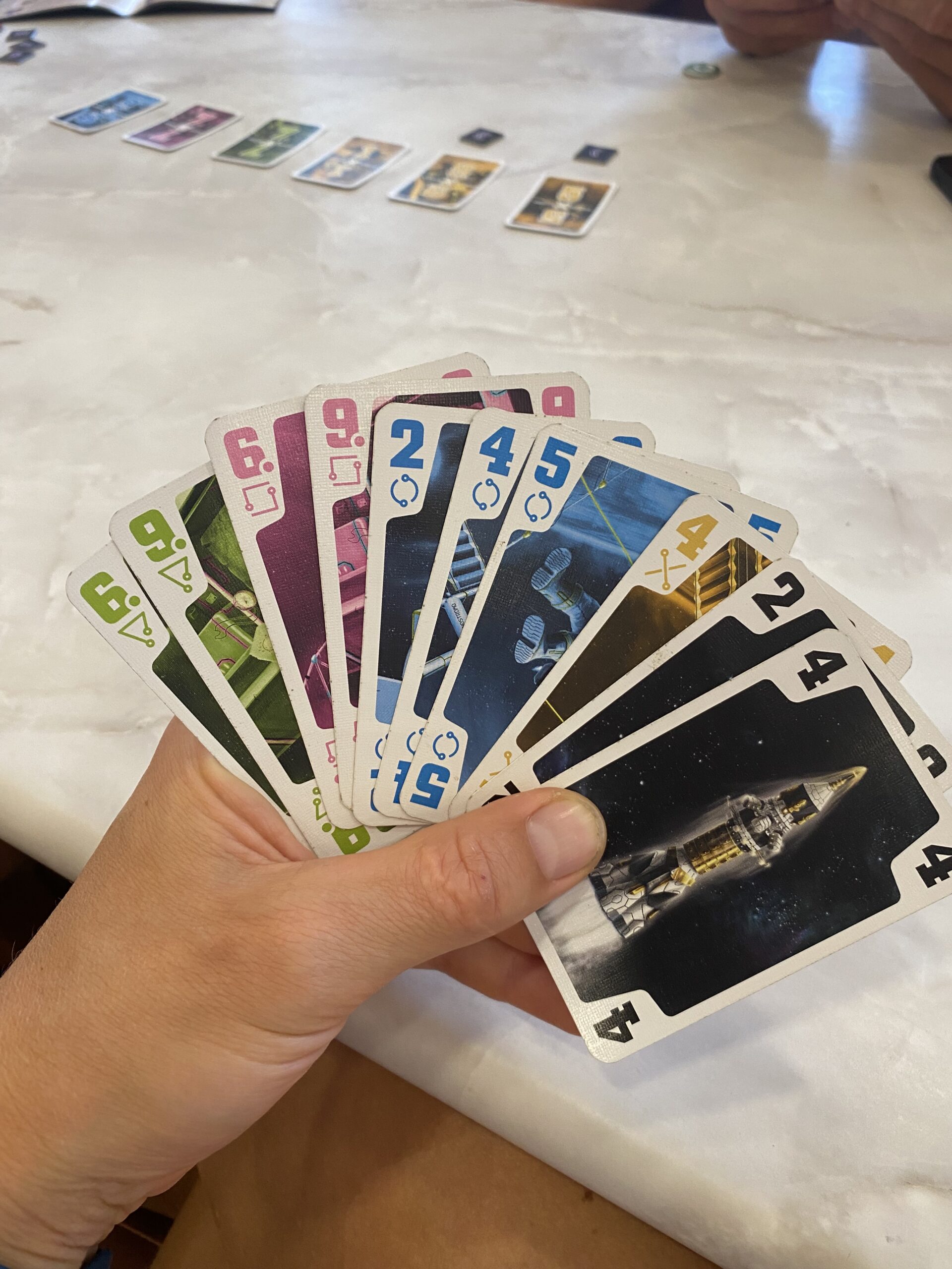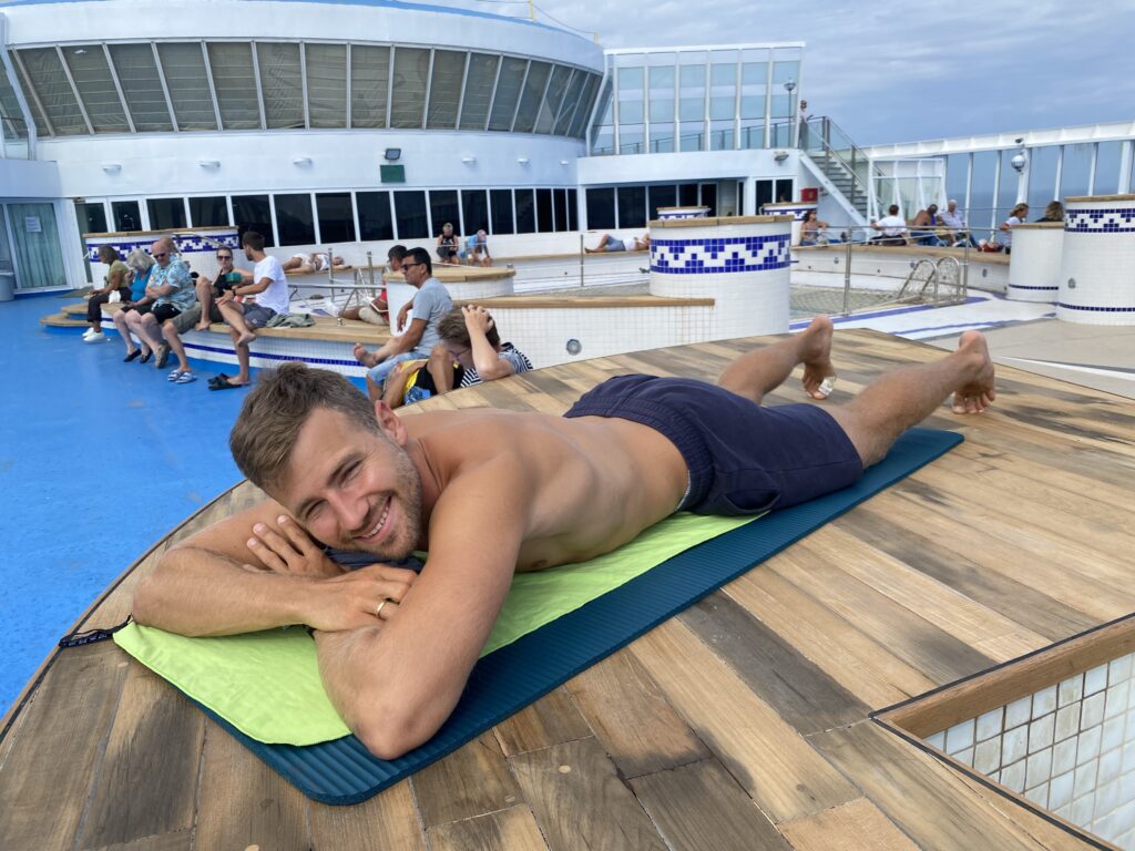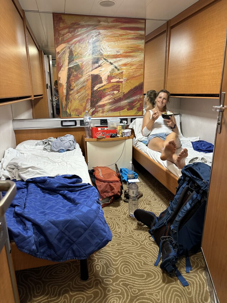 Unser Frühstücksmüsli haben wir bereits fix-fertig vorbereitet auf die Fähre mitgenommen und können es nun verspeisen. Den Kaffee holen wir uns in der Cafeteria, zu annähernd italienischen Normalpreisen. Wir beobachten die Hundesituation an Deck ein wenig. Es gibt eine „Hundewiese“ (Metallboden) auf der einige Besitzer mit ihren Hunden unterwegs sind. Man muss ein wenig aufpassen, denn an allen Geländern, Lampen und Ecken sind bereits Pinkelpfützen und für die großen Geschäfte gibt es Sackerlspender und Mülleimer. Es gibt auch einen Käfigraum für Katzen und Hunde, doch diese sind leer. Sämtliche Besitzer haben wohl die besonderen Tierzimmer gebucht oder sind mit ihren Hunden stets an Deck unterwegs. Gegen 10 treffen wir dann auf Roman und Sophie und chillen gemeinsam ein wenig in der Sonne. Bei einem Erkundungsrundgang auf der Suche nach einem stillen, windgeschützten Örtchen stellen wir fest, dass fast alle Spezialräume, wie Disco, Pool, Cardroom, Cinema leider geschlossen sind. So bleibt uns keine andere Wahl als uns ins Restaurant zu setzen um unsere „The Crew“ Missionen weiterzuspielen. Als dort dann um 12:30 die Essensausgabe startet, wird es etwas laut und wir wechseln den Platz. In Summe sind schon echt viele Menschen an Board und Cafeteria als auch Restaurant werden gut besucht. Wir verzerren unsere heutige Ration vom gestrigen Linsen-Dhal und legen uns dann am Nachmittag an Deck ein wenig in die Sonne. Ein kurzes Schläfchen tut sehr gut und gibt neue Energie.