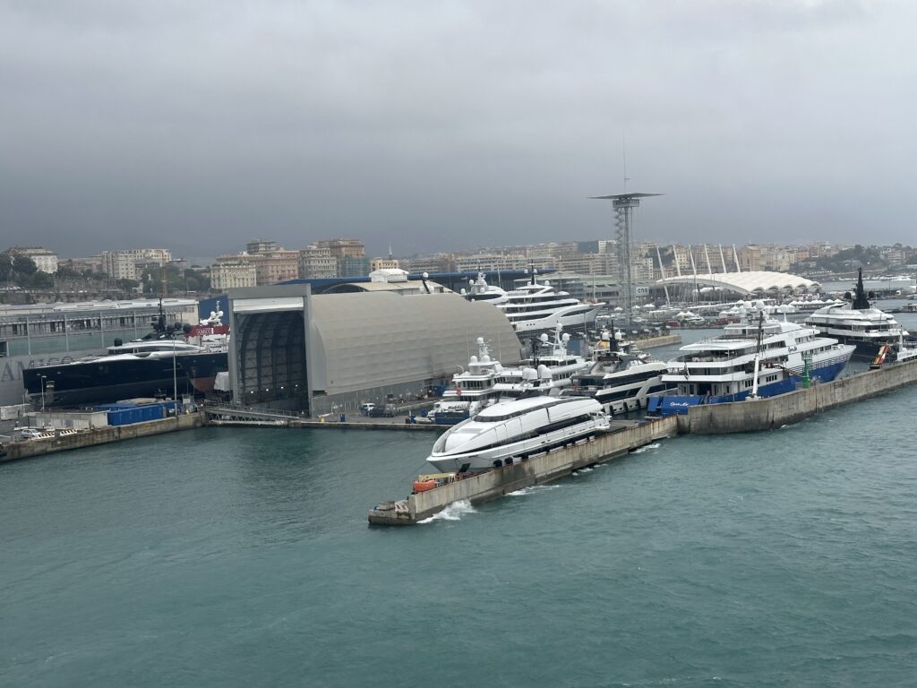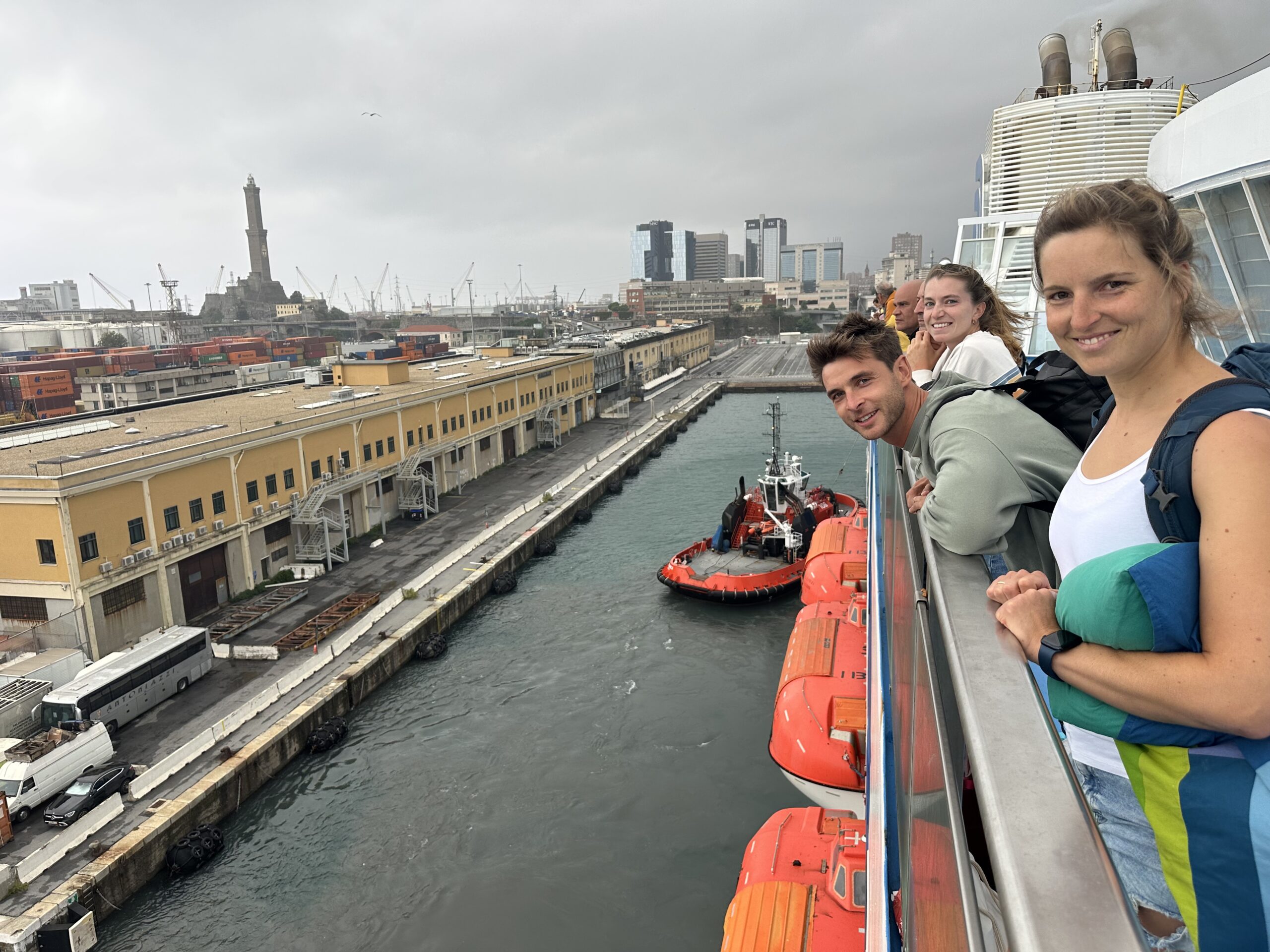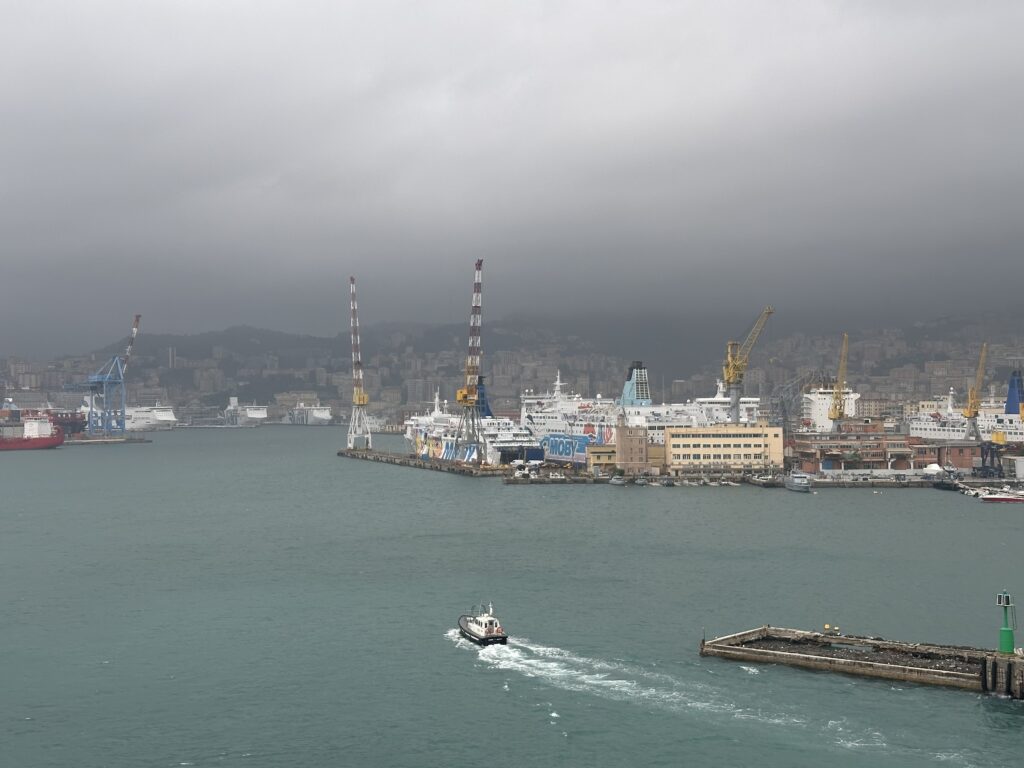 Etwas vor 16:00 kommt dann die Durchsage, dass wir aus den Kabinen auschecken sollten und um 18:00 in Genua einlaufen werden. Wir packen unsere Sachen und setzen uns mit den Rucksäcken nochmals ins Restaurant um die verbliebene Zeit noch weiterzuspielen. Das Wetter ist mittlerweile schlechter geworden, doch es regnet immerhin nicht. Als wir in den Hafen einlaufen gehen wir an Deck und beobachten das Spektakel. Genua erhebt sich vor uns an den Bergen der ligurischen Küste, die Berggipfel in dichten Wolken. Der Hafen ist erwartungsgemäß sehr groß und bietet vor allem für unzählige ähnlich gewaltige Fähren, wie die unsrige, ein Dock.