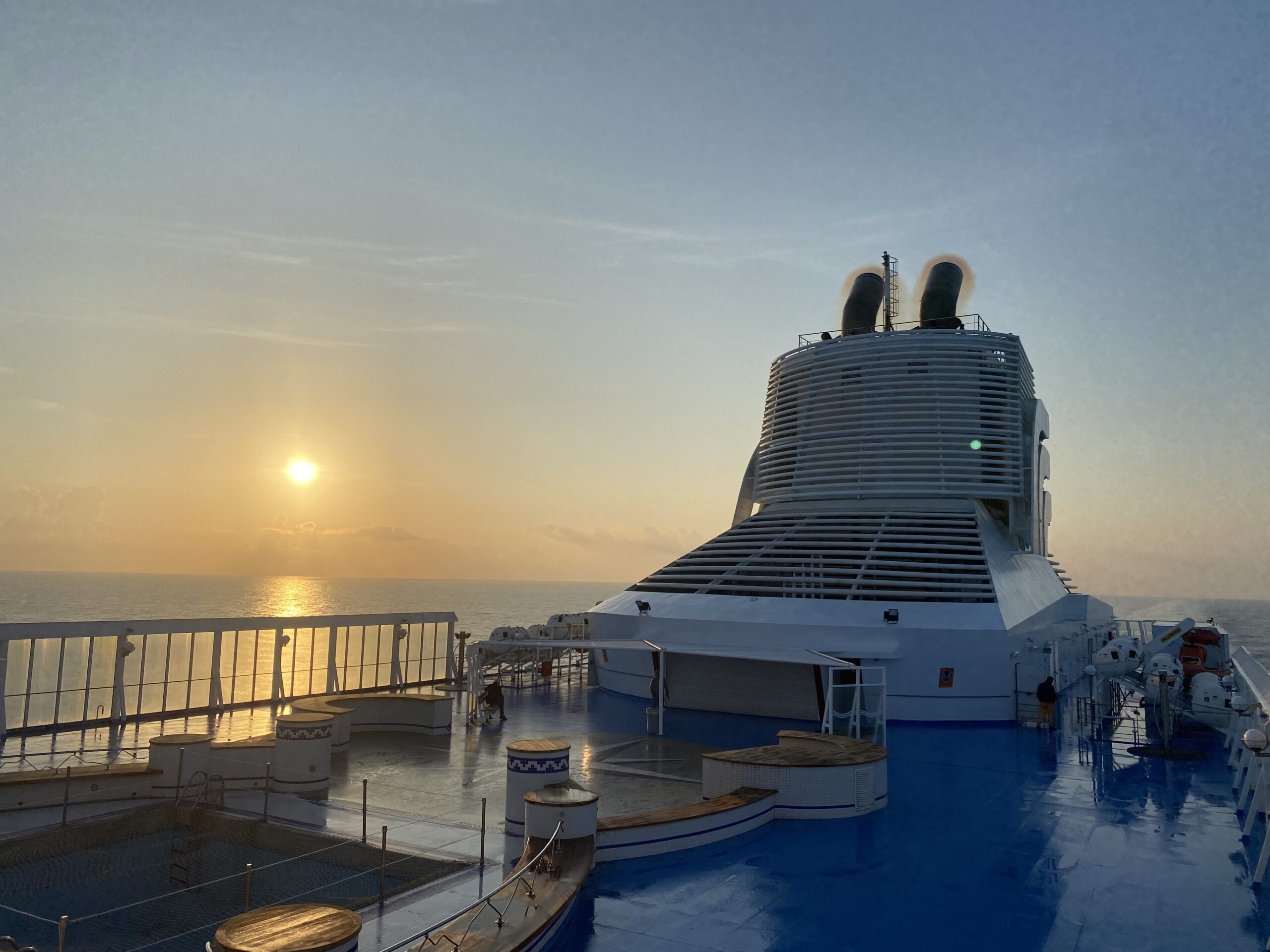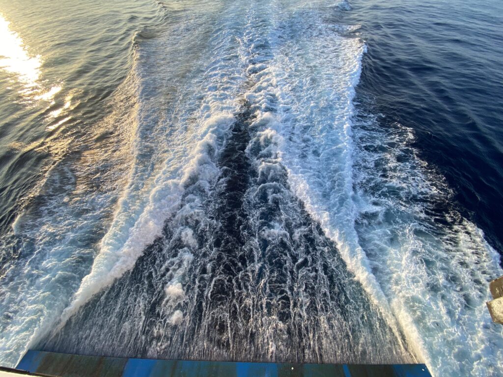 Der Schiffsdiesel vibriert etwas unregelmäßig. Einhergehend knarzt die Einrichtung etwas. Die Kabinen und Türen sind sehr hellhörig. Wir wachen in der Früh auf und haben nicht die leiseste Ahnung, wie spät es ist. In der Kabine ist es stockdunkel und das verwirrt unseren zirkadianen Rhythmus erstaunlicherweise gleich ziemlich. Es ist kurz vor 8. Wir flüchten aus der beengten Kabine und gehen 2 Stockwerke nach oben auf’s Deck, neugierig, was uns erwarten wird. Die Sonne scheint schon, bei blauem Himmel und wir sind bereits kurz vor Sardinien, am offenen Meer. Wir genießen den (Fahrt)wind und die Sonne ein wenig.