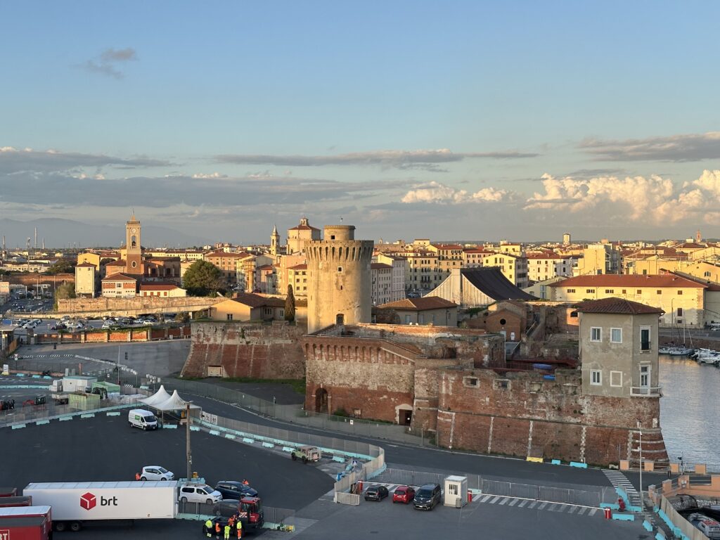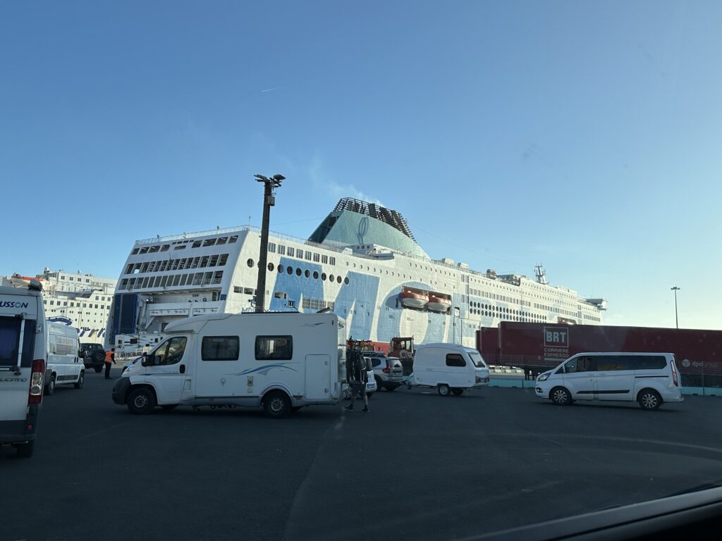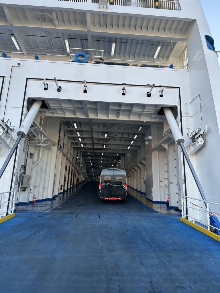 Gestärkt setzen wir die Fahrt fort, ich hab meinen Arbeitstag mittlerweile beendet und das Steuer übernommen. Eine halbe Stunde vor Ankunft in Livorno, stoppen wir zum Tanken und für einen Powernap, nachdem schon absehbar ist, dass wir die Fähre leicht erreichen werden und genug zeitlichen Puffer haben. Im Hafen angekommen, erwarten uns schon einige große Fährschiffe, eines davon die Moby Legacy. Wir warten nicht lange und können dann schon hinauf fahren. Imposant erstreckt sich die Garage in gigantischem Ausmaß über 3 Stockwerke.