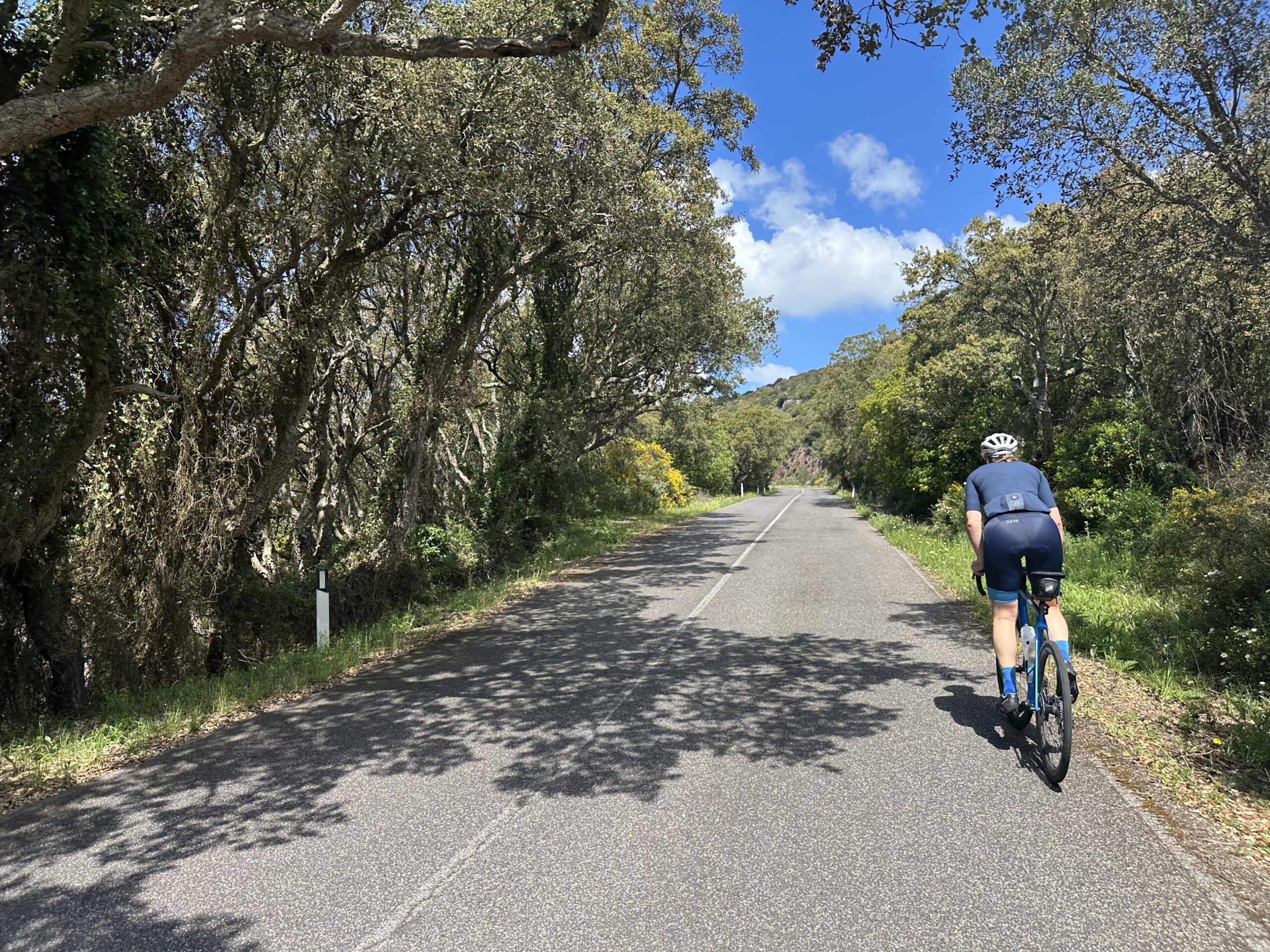 Nur ein, zwei süße Bergdörfer durchqueren wir bei unserer Fahrt durch die Berge, ansonsten geht es durch Weideland, Korkeichenwälder und sonstiges Gestrüpp. Am höchsten Punkt angekommen wird es doch ganz schön frisch, vor allem weil inzwischen immer mehr Wolken aufgezogen sind. Deswegen freuen wir uns, dass die Abwärtspassagen stets von kleineren Gegenanstiegen unterbrochen sind, um trotzdem warm zu bleiben.