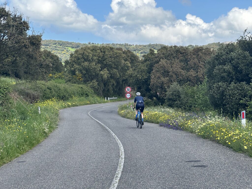 Jetzt wird es aber langsam Zeit für’s Loskommen, denn geplanterweise haben wir noch 100 km und 2000 Höhenmeter vor uns. Recht schnell sind die Räder vorbereitet und das Wichtigste eingepackt. Sogleich geht es mit den ersten Höhenmetern los. Die Sonne scheint, die Beine fühlen sich frisch an und die Höhenmeter purzeln nur so dahin. Wir genießen die Landschaft und die bunt blühende Blumenwelt des offensichtlich eingetroffene Frühlings. Es geht quer durch die satt-grüne Hügelwelt und wir genießen es richtig. Überall blüht der Ginster, mit einem tollen Geruch und einem leuchtenden Gelb, das an Rapsfelder von zuhause erinnert. Es ist überhaupt kein Verkehr.