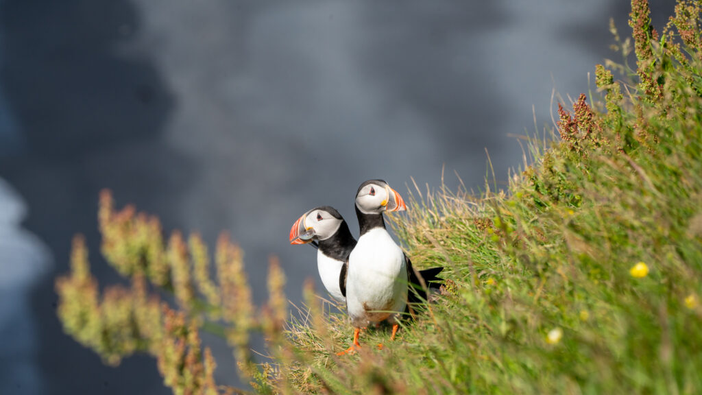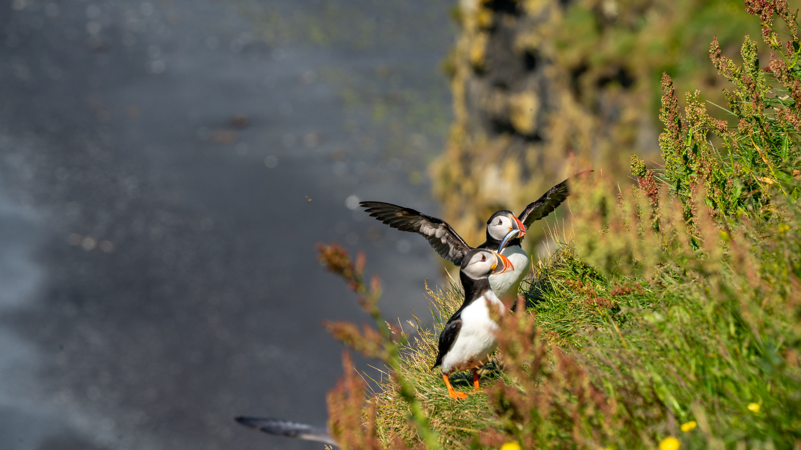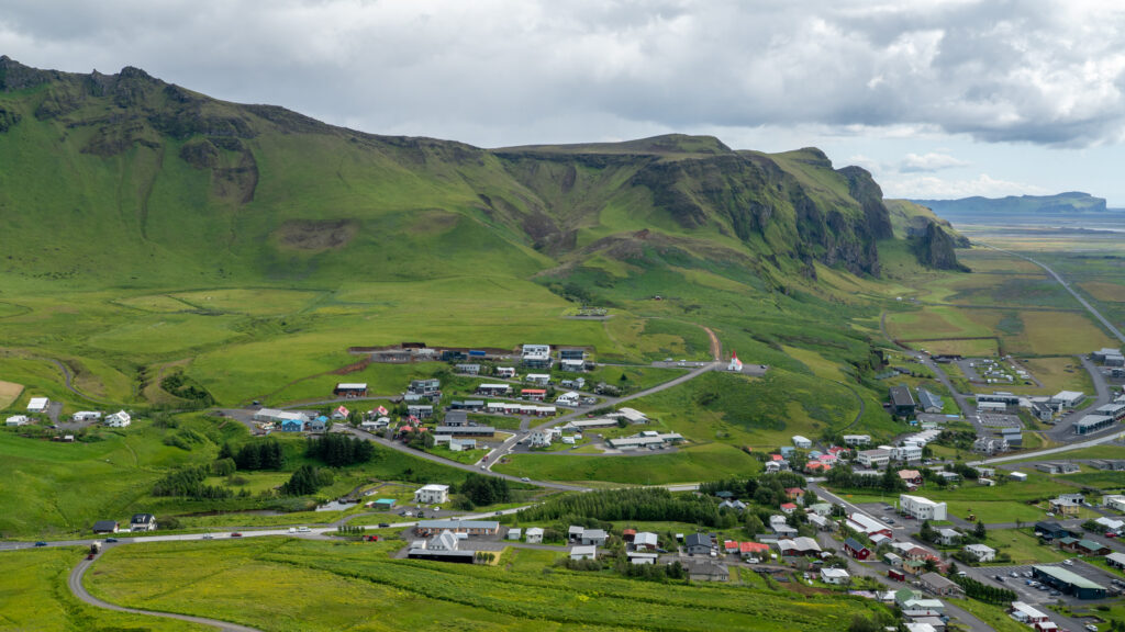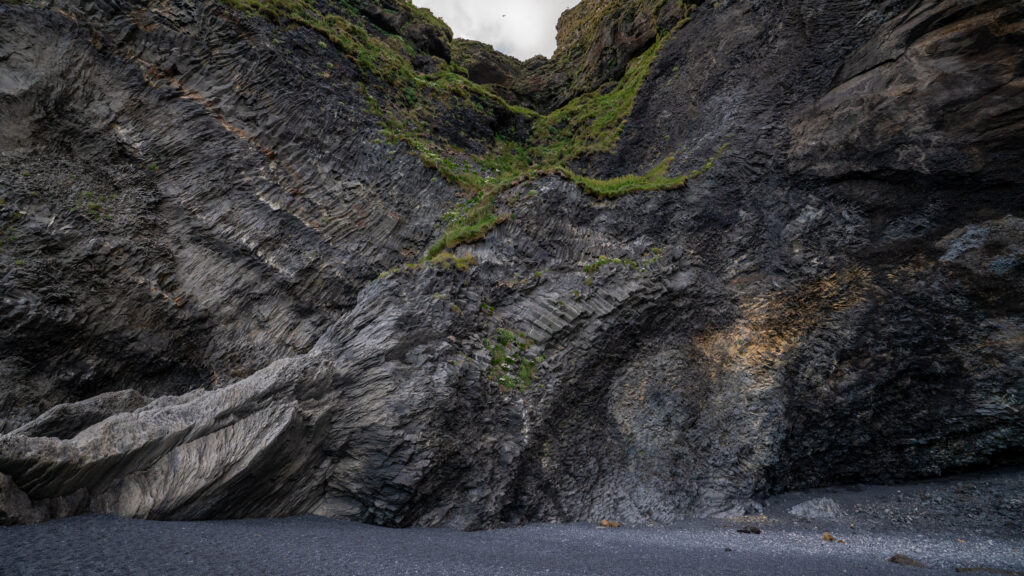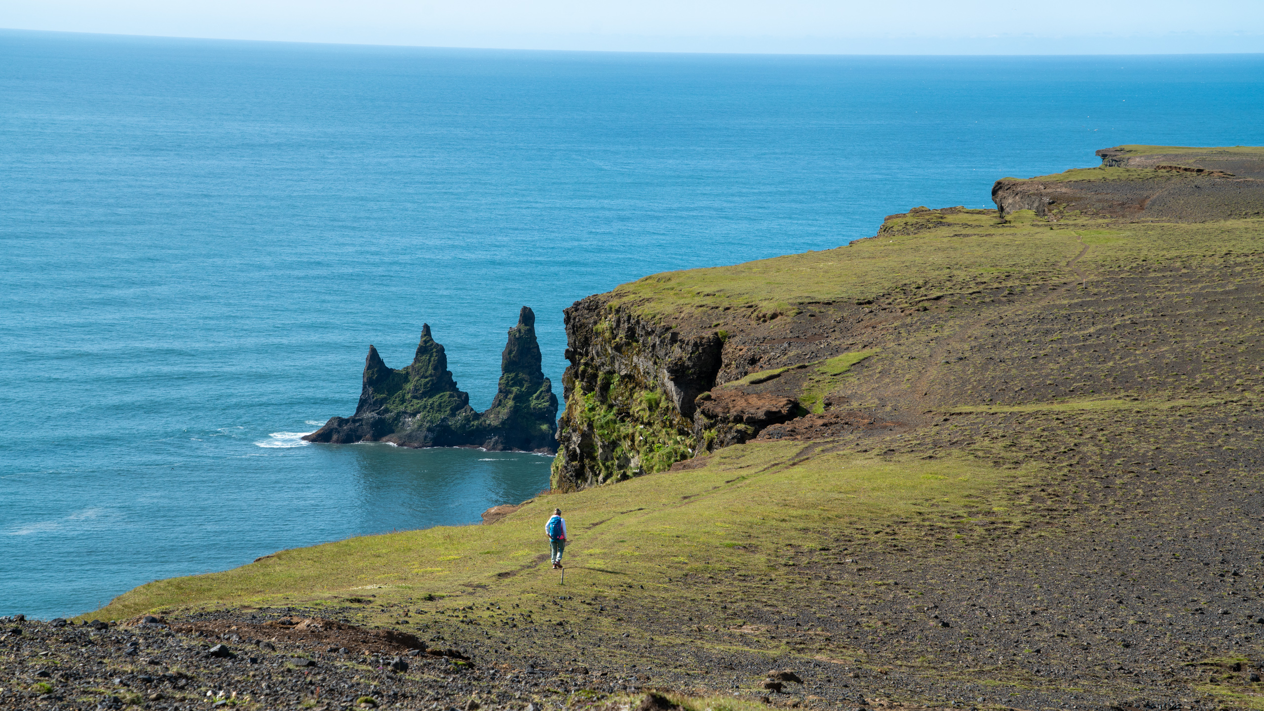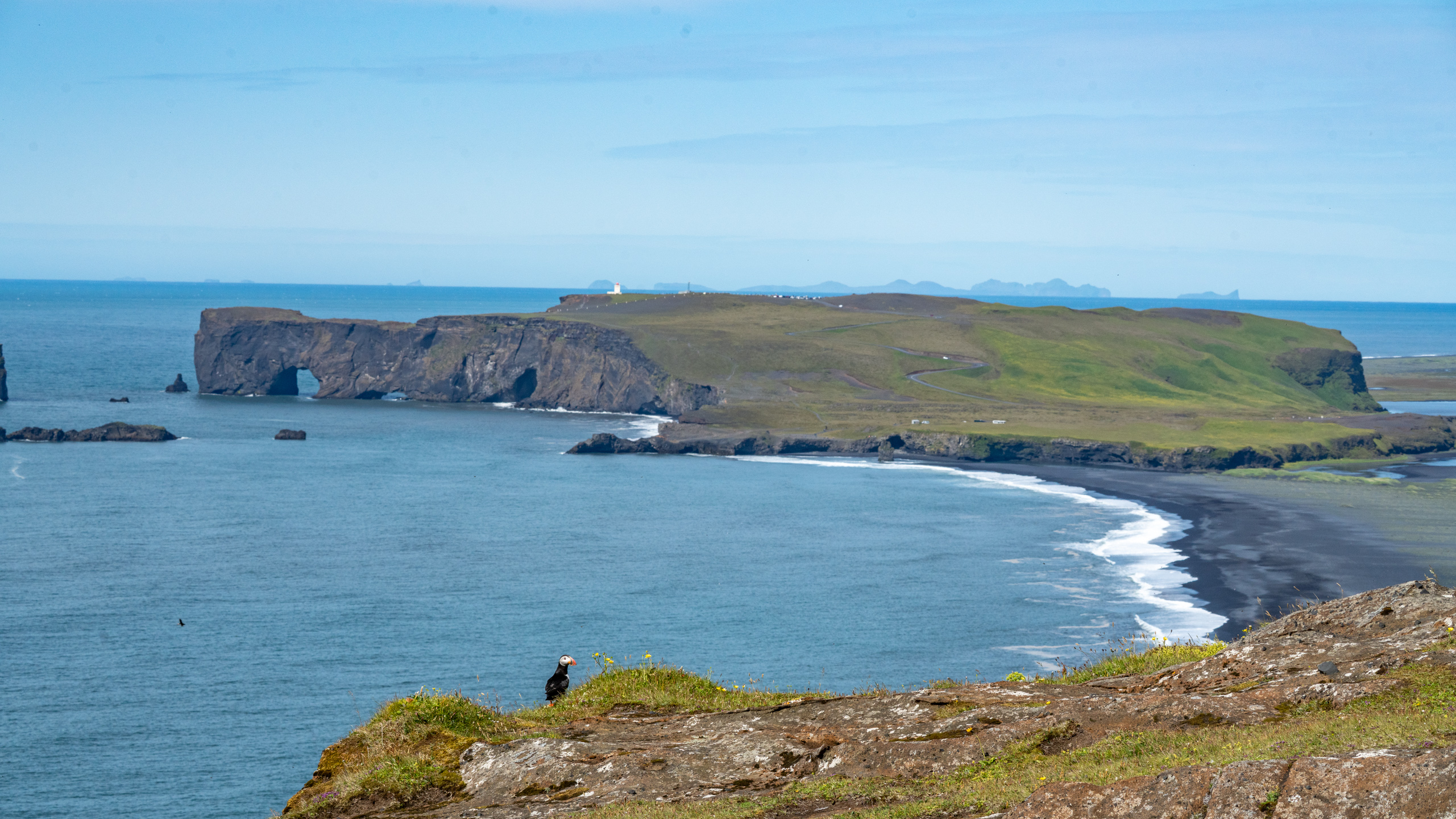 Wir fahren die Ringstraße eine halbe Stunde lang im Uhrzeigersinn zurück in Richtung Reykjavik. Auf dem Weg passieren wir imposante Felsklippen, und zur Rechten breitet sich immer wieder eine riesige Gletscherfläche aus – weniger als 1.000 Höhenmeter über dem Meer. Neben dem schwarzen, weitläufigen Strand und sattgrünen Wiesen erreichen wir schließlich einen großen Parkplatz direkt an der Straße.