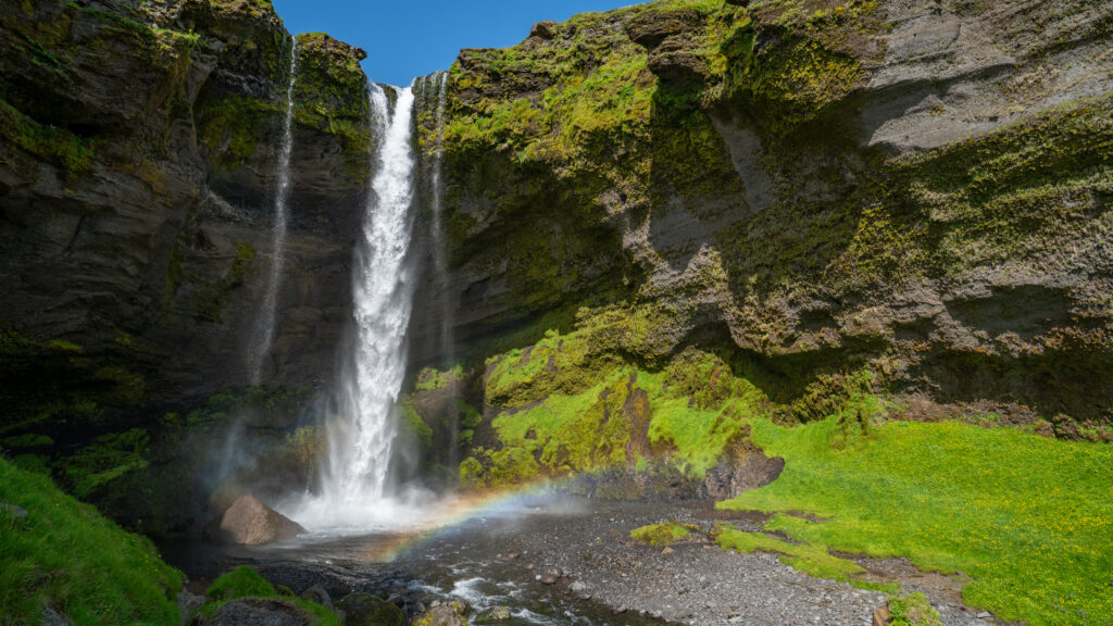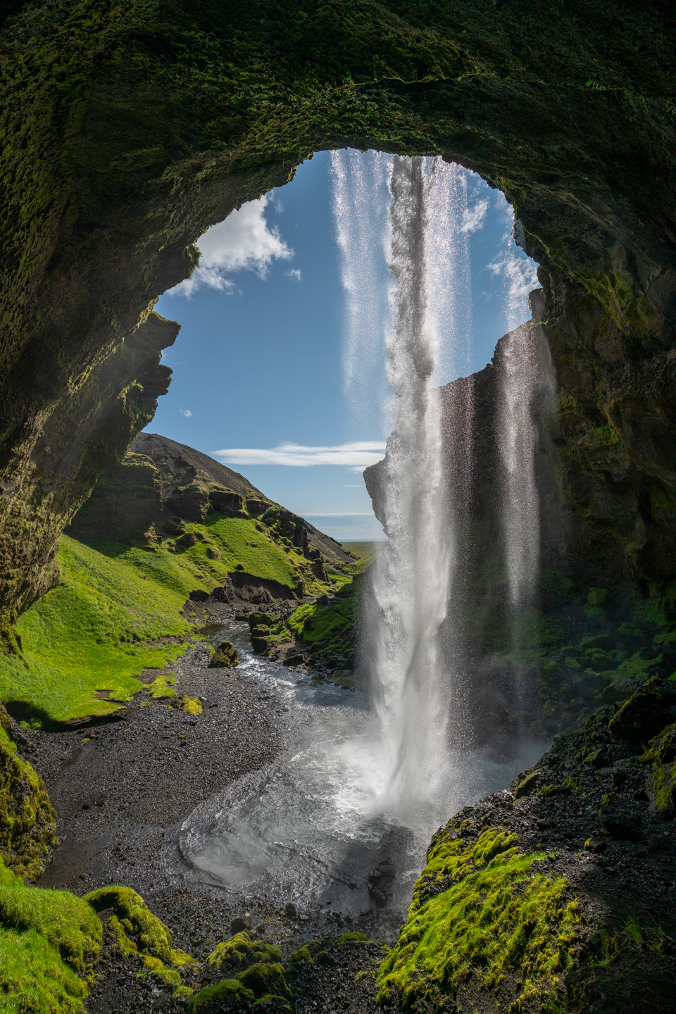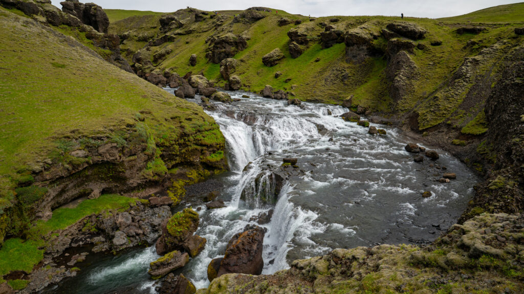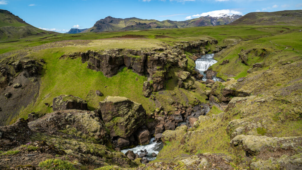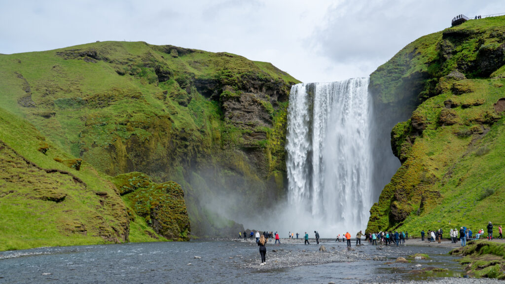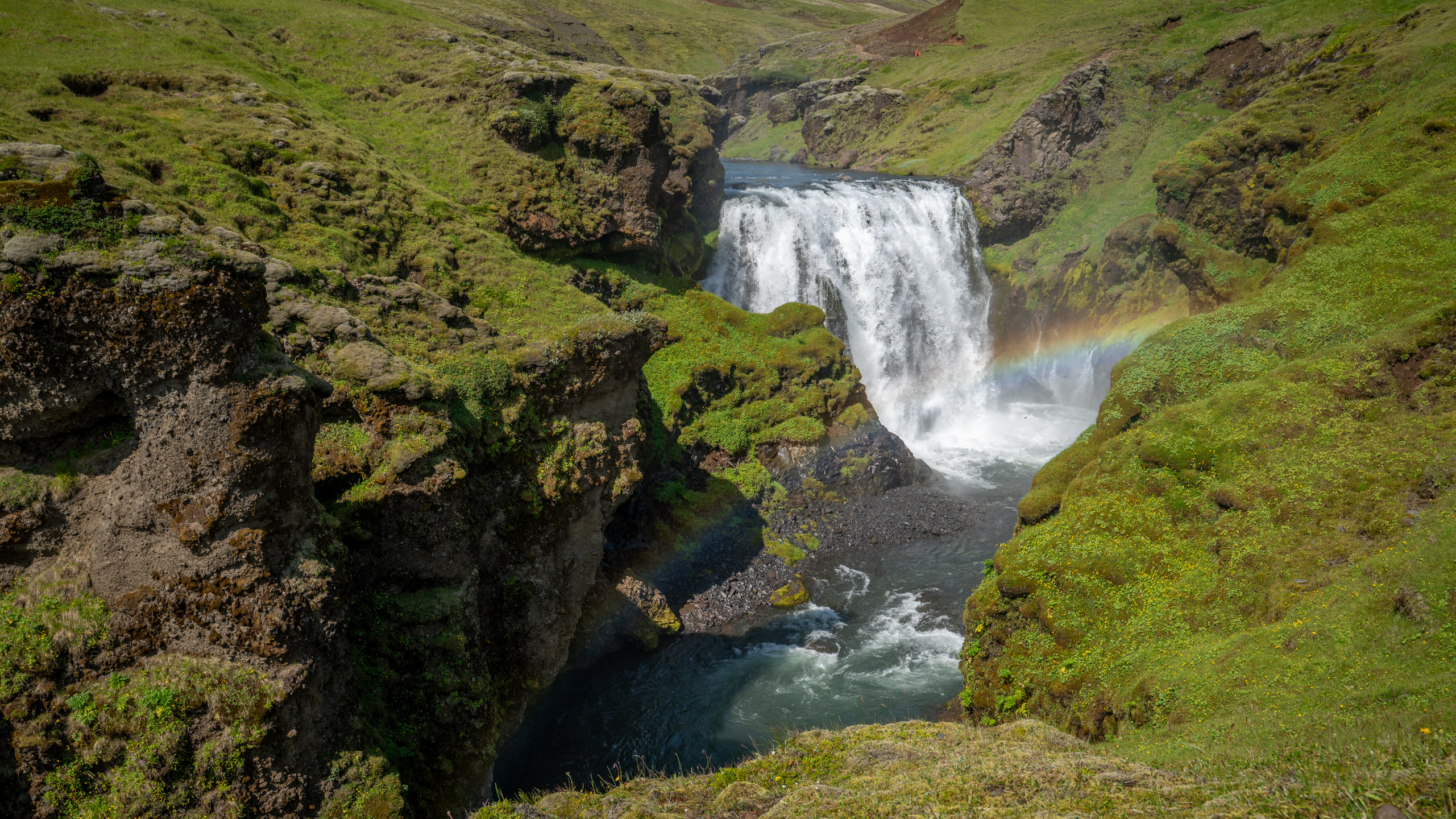 Schon von weitem sehen wir den gewaltigen Skógafoss, einen der bekanntesten Wasserfälle Islands. Viele Menschen tummeln sich sowohl am Fuße des Wasserfalls als auch auf den Stufen, die neben ihm nach oben führen. Wir reihen uns ein und steigen hinauf – oben angekommen, führt ein Wanderweg weiter in das Tal hinter dem Wasserfall.