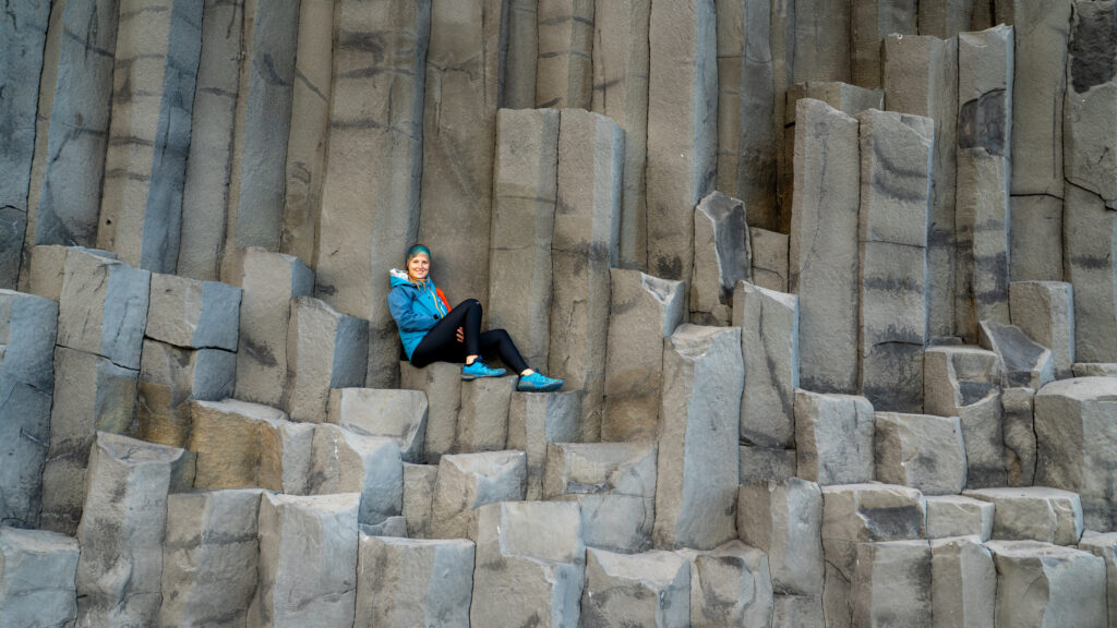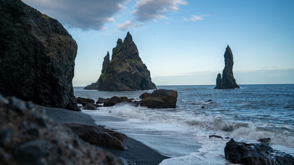 Das Wetter ist etwas schlechter geworden, wir haben nicht wirklich Abendsonne, dafür aber umso mehr Wind und wieder kältere Temperaturen. Wir spazierden den schwarzen Kiesstrand entlang, vorbei an den Basaltsäulen und imposanten Steinsformationen. Draußen am Meer ragen die Felsspitzen in den Himmel.