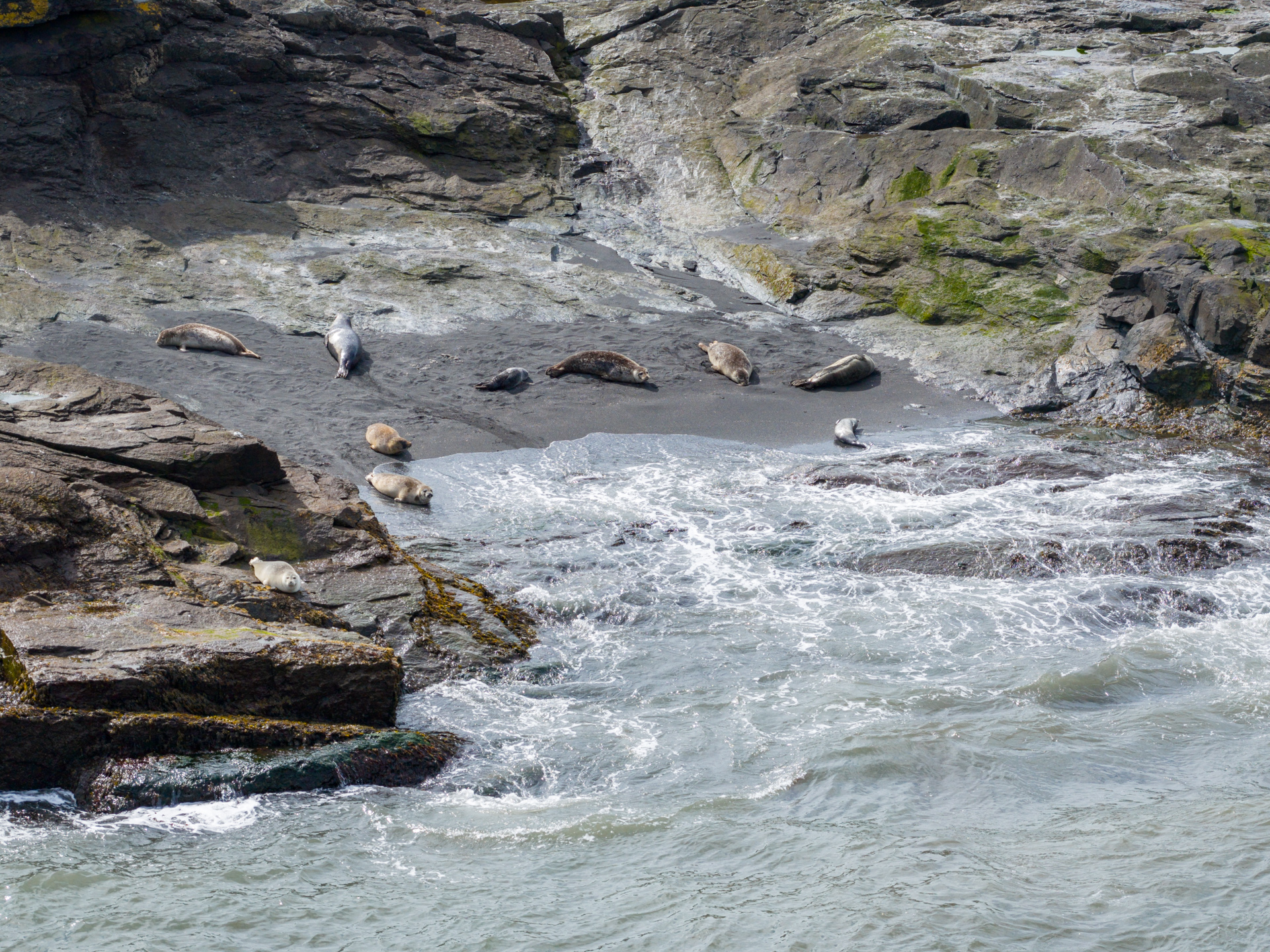 Anschließend machen wir noch einen Abstecher zur Küste: Tatsächlich liegen dort Robben auf den Felsen – träge und zufrieden in der Sonne. Einige schwimmen durch die Bucht, andere blicken neugierig zu uns herüber.