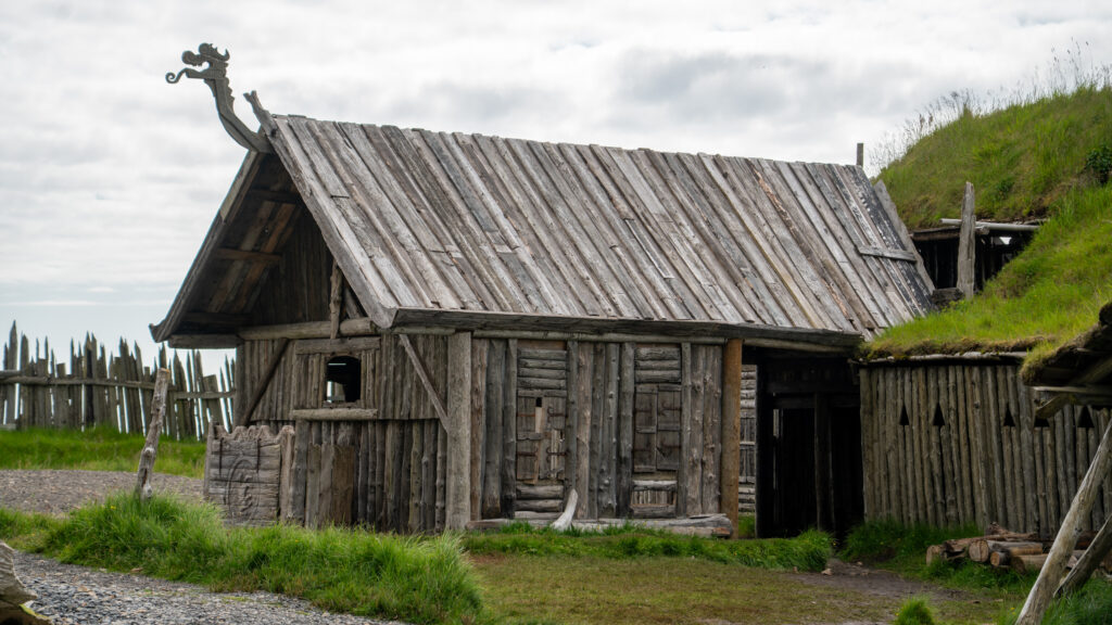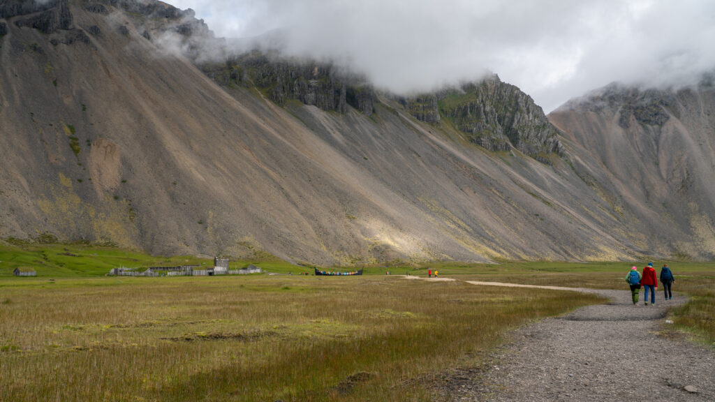 Da die Bergkette jedoch noch in dichte Wolken gehüllt ist, besuchen wir zunächst das vorgelagerte Wikingerdorf, das ursprünglich für Filmaufnahmen errichtet wurde. Die Holzhäuser mit Grasdächern, geschnitzten Türpfosten und rauchgeschwärzten Innenräumen versetzen uns in eine andere Zeit – auch wenn man merkt, dass es eher eine romantisierte Kulisse als ein realistisches Abbild ist. Außerdem ist es inzwischen schon etwas in die Jahre gekommen.