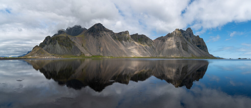 Unser erstes Ziel ist das Kap Stokksnes. Dort erhebt sich die Bergkette Vestrahorn, deren dunkle Zacken schroff in den Himmel ragen. Der schwarze Sandstrand davor bildet einen starken Kontrast zu den spitzen Gipfeln, und in den seichten Lagunen spiegelt sich das Panorama eindrucksvoll wider.
