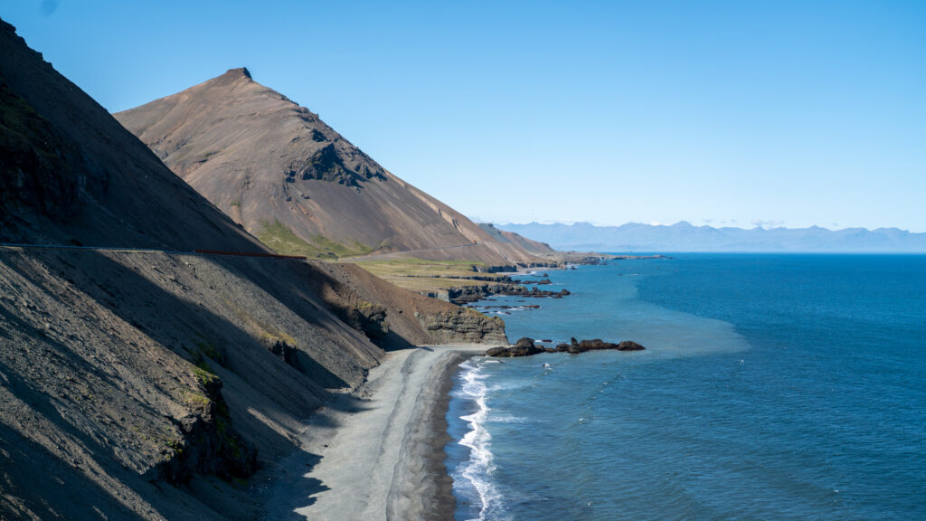 Die Straße schlängelt sich entlang der Küste, vorbei an Fjorden, steilen Klippen und weiten Ebenen. Die Sonne begleitet uns dabei unermüdlich. Später zweigen wir ins Landesinnere ab – unerwarteterweise auf eine Schotterstraße.