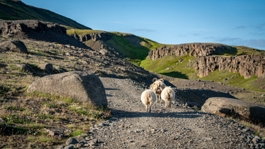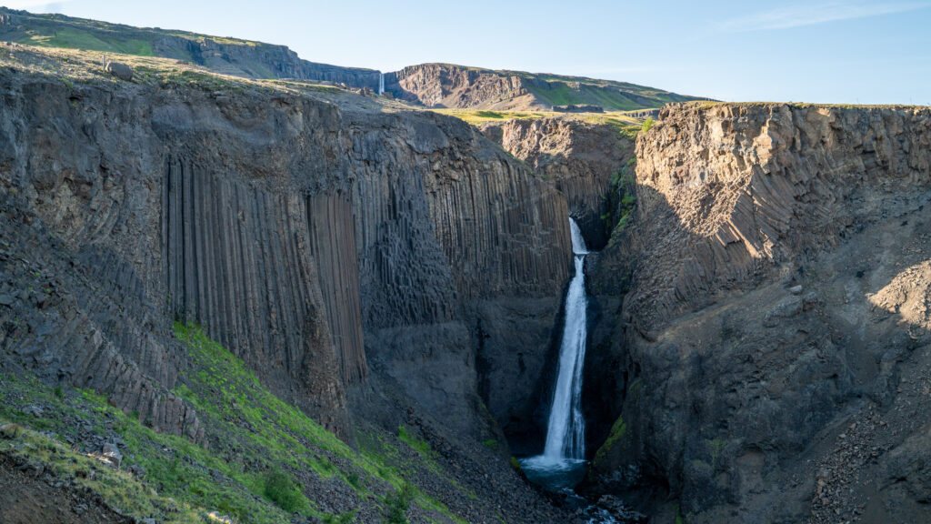 Der Weg führt entlang des Flusses und bietet unterwegs mehrere fantastische Ausblicke, besonders auf den Litlanesfoss – einen kleineren Wasserfall, der von beeindruckenden Basaltsäulen eingerahmt ist wie ein Naturtheater.