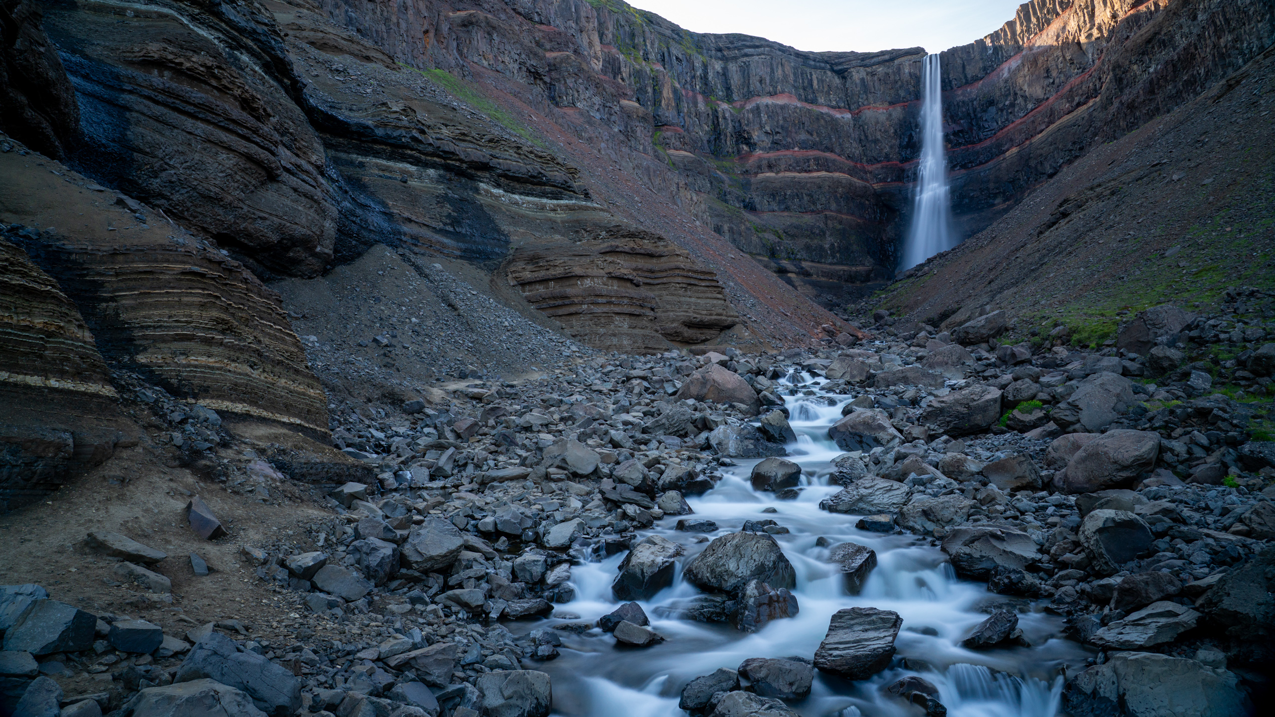 Nach weniger als einer Stunde stehen wir schließlich vor dem Hengifoss: 128 Meter stürzt das Wasser in die Tiefe, eingerahmt von rötlich-braunen und schwarzen Gesteinsschichten, die eindrucksvoll von der vulkanischen Geschichte dieser Region erzählen.