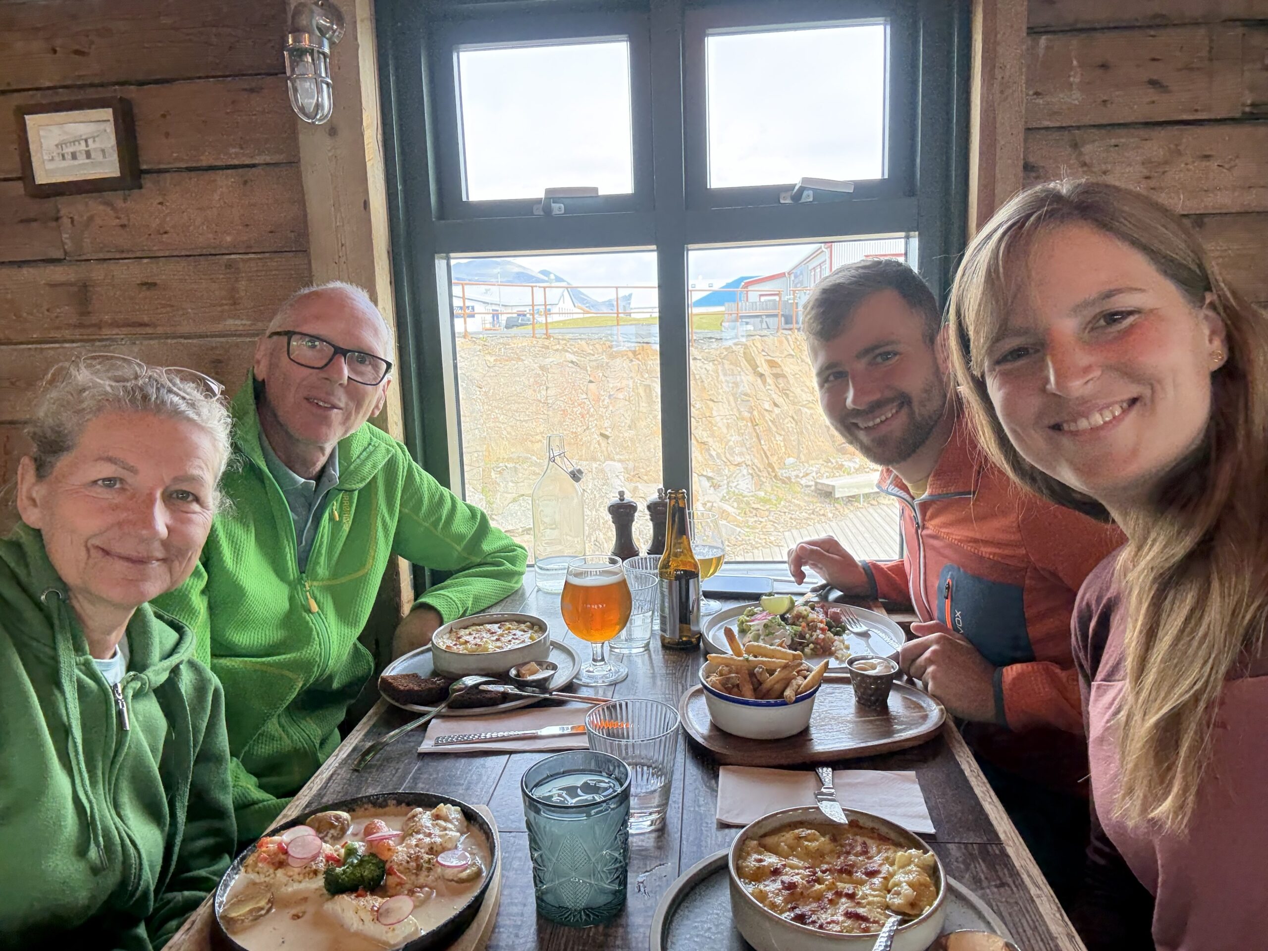 Gegen Mittag erreichen wir Höfn, ein kleines Städtchen, das für seinen Hummer bekannt ist. Im Restaurant Pakkhús, direkt am Hafen, gönnen wir uns ein hervorragendes Mittagessen – Fish Stew, Tuna Steak, Kabeljau und zum Abschluss ein Lava-Skyr-Dessert. Das Lokal befindet sich in einem alten Lagerhaus mit rustikalem Charme, serviert jedoch überraschend feine Küche.