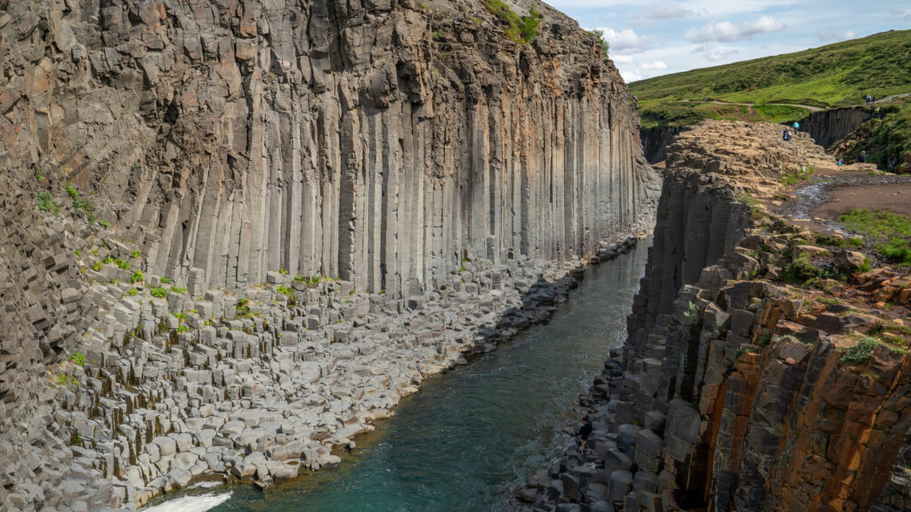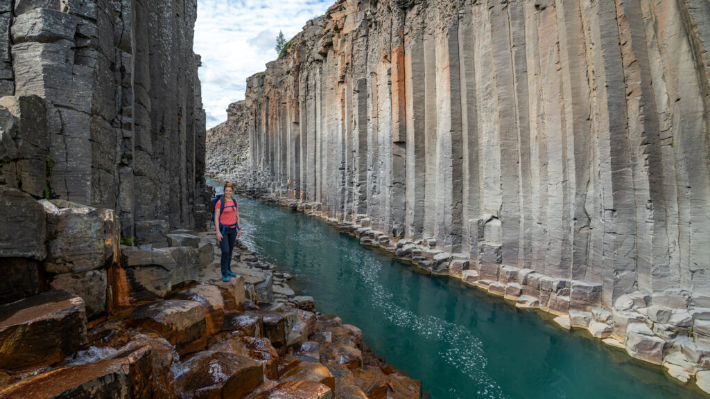 Auch heute fahren wir wieder entlang der Ringstraße weiter. Wir durchqueren Hochebenen, passieren dunkle Berge und Lavagesteinsfelder, ehe wir auf eine Schotterstraße abbiegen, die uns zur Westseite des Stuðlagil-Canyons bringt. Wir parken auf einem Parkplatz und haben noch gut zwei Kilometer Schotterweg zu Fuß vor uns, um zum eindrucksvollsten Teil der Schlucht zu gelangen. Dort erwarten uns faszinierende Basaltformationen und ein engeres Stück, durch das der türkisfarbene Fluss fließt. Überall klettern Touristen herum – und wir tun es ihnen gleich. Einige schwimmen sogar im Fluss und posieren auf den Basaltsäulen auf der anderen Seite.