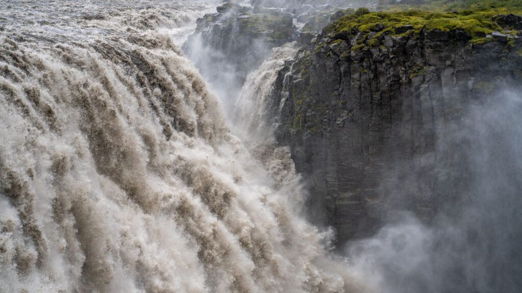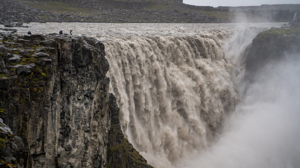 Leider verschlechtert sich das Wetter zunehmend. Als wir unser nächstes Ziel erreichen, beginnt es bereits leicht zu regnen. Beim Dettifoss angekommen, ist es so feucht, dass Mama und Klaus im Auto bleiben. Eva und ich gehen die wenigen Meter hinunter zum Rand des Abgrunds und bestaunen die gigantischen Wassermassen, die direkt vor uns tosend in die Tiefe stürzen.