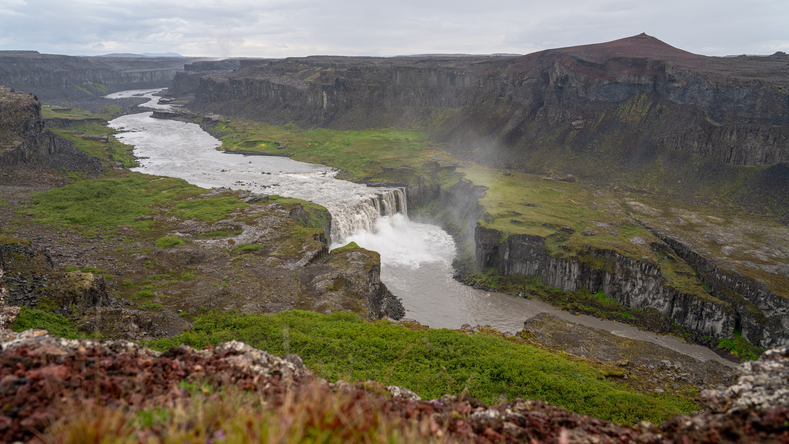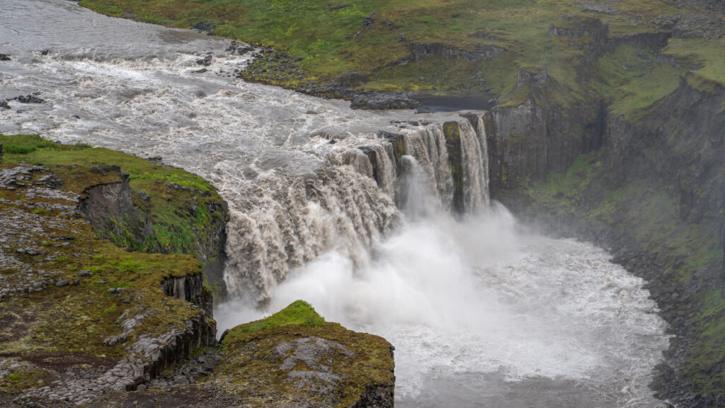 Anschließend fahren wir noch etwa fünf Minuten weiter zu einem Aussichtspunkt am Hafragilsfoss, wo sich uns ein atemberaubendes Panorama über die weitläufige Schlucht bietet. In den ruhigen Kehrwässern klärt sich das zuvor sedimentreiche Wasser, und plötzlich ist es ganz klar.