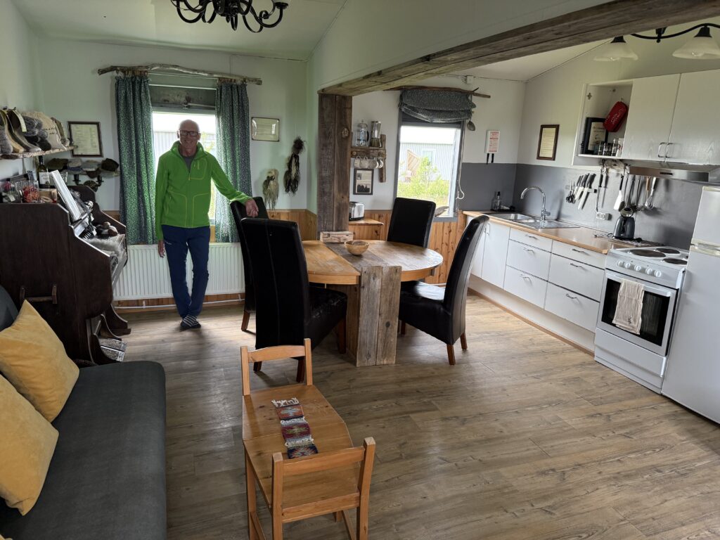 Er hat vor ein paar Jahren eine Tirolerin kennengelernt, die bei ihm ein Zimmer gemietet hatte. Sie entschloss sich daraufhin, nach Island auszuwandern. Gemeinsam bauten sie ein neues Haus und vermieten nun das alte. Oli stammt ursprünglich aus einer Schäferfamilie. Die beiden haben sehr viel Liebe zum Detail in die Unterkunft gesteckt – sie wirkt fast wie ein kleines Heimatmuseum, mit zahlreichen Kunstwerken, alten Gegenständen, Bildern und erklärenden Texten.