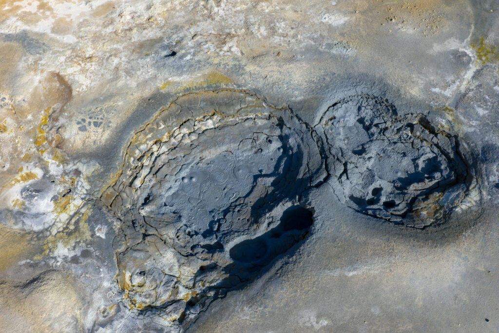 Als Erstes fahren wir nach Hverarönd bzw. Hverir. Das Gebiet liegt an der Flanke des Námafjall und bietet zahlreiche vulkanische Erscheinungen. Generell ist die gesamte Region stark von vulkanischer Aktivität geprägt, da sich hier die beiden tektonischen Plattenränder jährlich um etwa zwei Zentimeter voneinander entfernen. Überall blubbert und zischt es aus dem Boden, begleitet von einem intensiven Schwefelgeruch. Man darf nur auf ausgeschilderten Wegen gehen, denn wenn man irgendwo einbricht, kann es darunter sehr heiß werden und man zieht sich Verbrennungen zu. Die Menschenmenge hält sich aufgrund der frühen Uhrzeit noch in Grenzen.