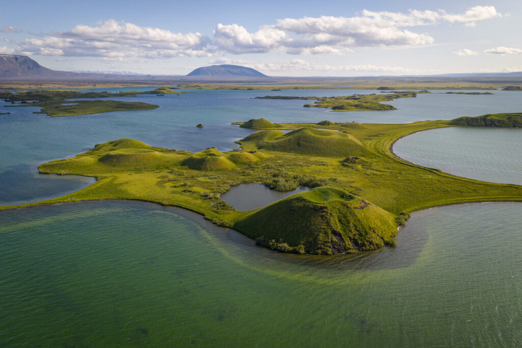 Nach der Wanderung ist es bereits 14:00 Uhr. Wir fahren zum Mittagessen in unsere Unterkunft zurück, die ohnehin am Weg liegt. Nach dem Essen – inklusive köstlicher Heidelbeer-Skyr-Nachspeise – setzen wir Magdi und Klaus beim „Fuglasafn Sigurgeirs“ ab, einem Vogelmuseum, das in Gedenken an einen bei Schlechtwetter verstorbenen Hobby-Ornithologen am Mývatn errichtet wurde. Währenddessen fahren Eva und ich ans Südufer des Mývatn und spazieren durch grasbewachsene Hügel direkt am See. Die Landschaft ist geprägt von unzähligen kleinen, bewachsenen Vulkankegeln. Wir beobachten viele verschiedene Vögel und Enten.