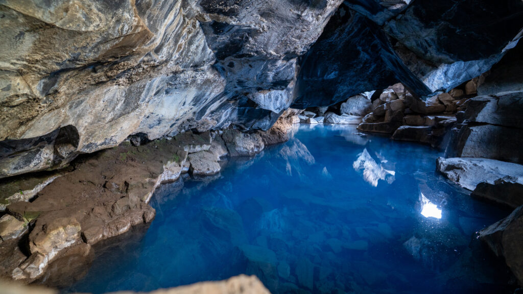In der Nähe besuchen wir noch Grjótagjá – eine kleine Höhle in einem Felsriss, gefüllt mit blauem, dampfendem, warmem Wasser. Man muss ein paar Meter über Felsblöcke hineinsteigen. Durch Spalten in der Decke fällt Licht hinein, und der aufsteigende Dampf verleiht der Höhle eine mystische Atmosphäre. Hier wurde übrigens die berühmte Szene aus Game of Thrones gedreht, in der Jon Snow mit Ygritte ein Techtelmechtel hat.