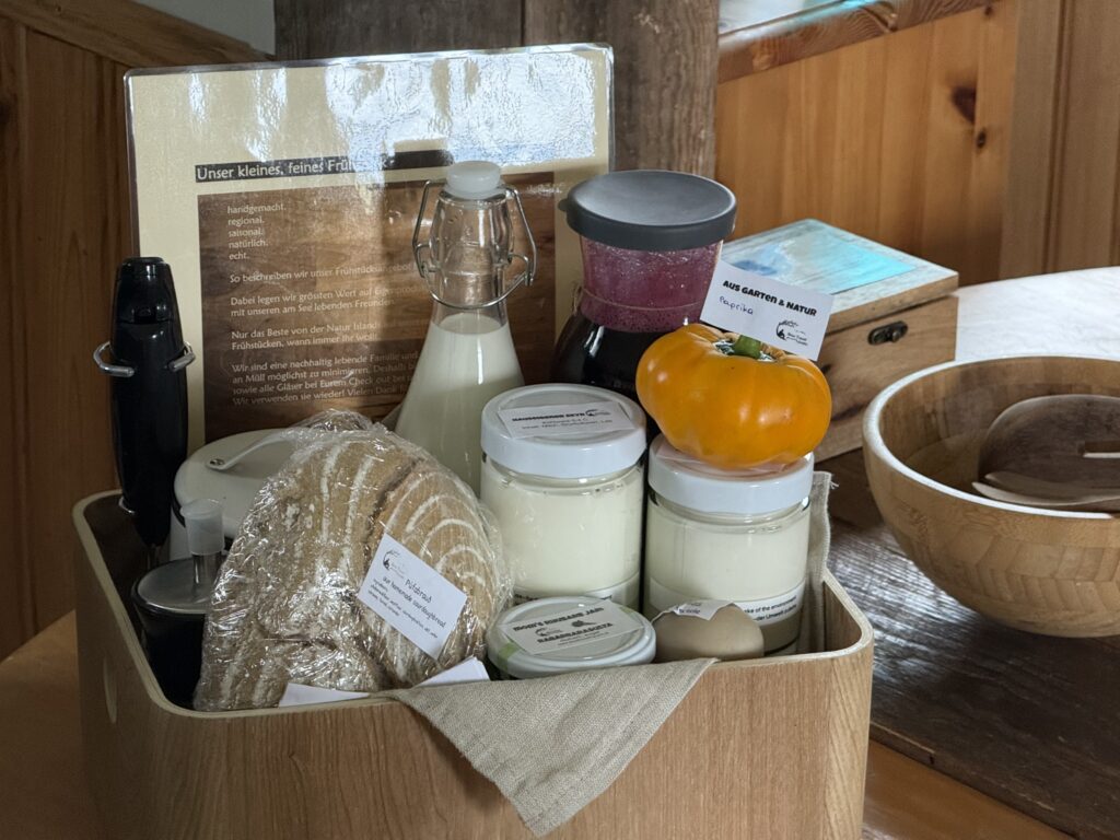Bianca bringt uns auch unser Frühstück für den nächsten Tag: selbst gebackenes Brot aus dem geothermalen Ofen, Skyr, Rhabarbersaft – und sogar Enteneier sind im Korb. Nach dem netten Gespräch ist die Sonne hinter dem Berg nebenan bereits untergegangen (22:10), und wir beeilen uns, ins Bett zu kommen und noch ein paar Dinge für den morgigen Check-out vorzubereiten.