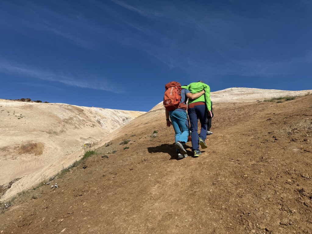 Nachdem wir durch die Ansammlung an Fumarolen (kleine Öffnung im Erdboden, aus der Wasserdampf und heiße vulkanische Gase austreten), Solfataren (Exhalationen, die reich an Schwefelverbindungen wie Schwefelwasserstoff sind) und Schlammlöchern geschlendert sind, hängen wir noch eine kurze Rundwanderung auf den benachbarten Berg Námafjall an. Der Weg wird stellenweise überraschend steil und rutschig. Ich stütze Klaus und wir gehen gemeinsam hinauf, um die Sturzgefahr für ihn zu minimieren. Oben angekommen, genießen wir ein beeindruckendes 360°-Panorama: vulkanische Hügel, Kraterlandschaften, weite Ebenen – und ein Blick auf den großen See Mývatn. Bei strahlendem Sonnenschein, rund 20 Grad und lebhaftem Wind wandern wir zurück zum Auto.