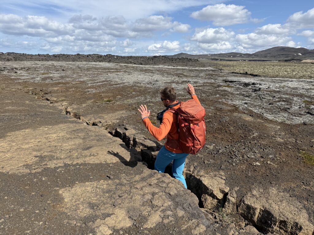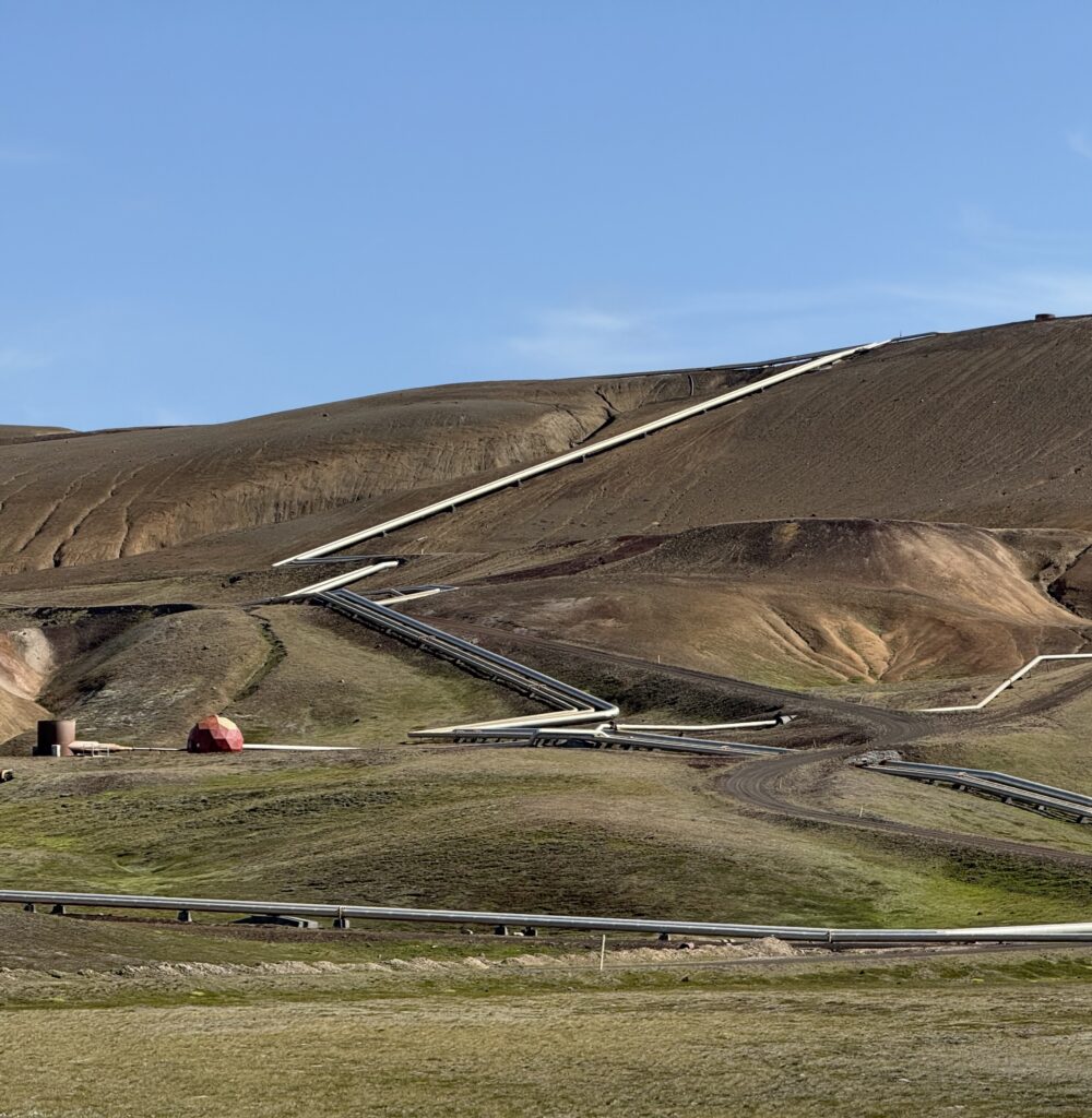 Nach diesem spannenden Einblick in die Technik machen wir eine weitere Wanderung durch das Gebiet rund um das Kraftwerk – jenes, das bei den Ausbrüchen 1977, den sogenannten „Feuern von Krafla“, betroffen war. Wir durchqueren dabei rote und bunte Hügel, erstarrte Lavafelder und kleinere Explosionskrater – eine beeindruckende Landschaft.