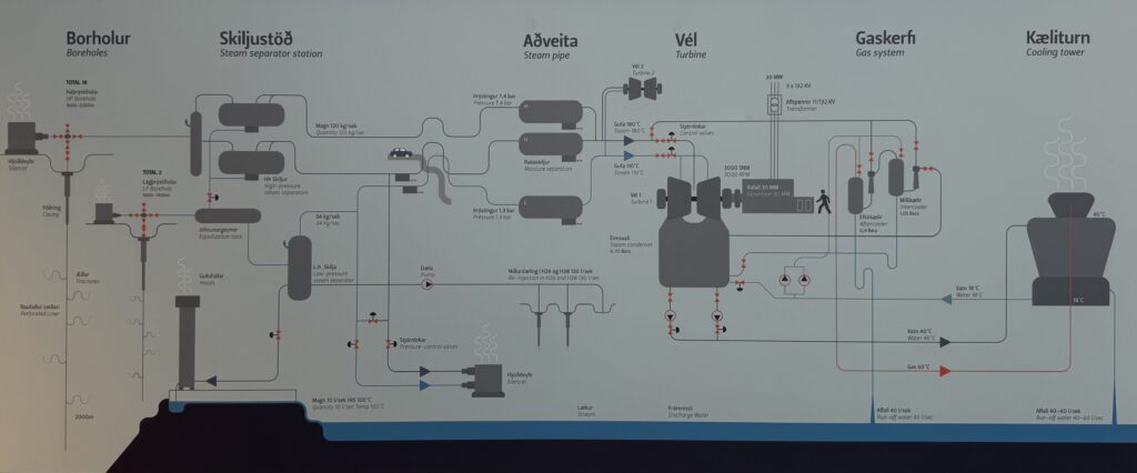 Anschließend besuchen wir das Visitor Center bzw. ein kleines Museum im Kraftwerk und erfahren interessante Details über diese Form der nachhaltigen Energiegewinnung. 1977 kam es hier durch tektonische Verschiebungen zu Vulkanausbrüchen, die tagelange Feuer verursachten. Auch heute rechnen die Betreiber damit, dass wieder etwas passieren kann – im schlimmsten Fall könnte das Kraftwerk zumindest teilweise zerstört werden. Die 33 Bohrlöcher reichen meist etwa zwei Kilometer tief und damit nahe an die flüssige Lava heran. Das natürlich im Boden vorhandene Wasser wird als Dampf-Wasser-Gemisch an die Oberfläche gedrückt, mithilfe von Separatoren getrennt, sodass reiner Dampf übrig bleibt, der dann zwei Stromturbinen antreibt. Anschließend wird der Dampf kondensiert und das dabei noch heiße Wasser teils für Fernwärme genutzt, teils zurück in ungenutzte Bohrlöcher gepumpt, um den Kreislauf zu schließen. Rund ein Drittel des isländischen Stroms stammt aus geothermischer Energie.