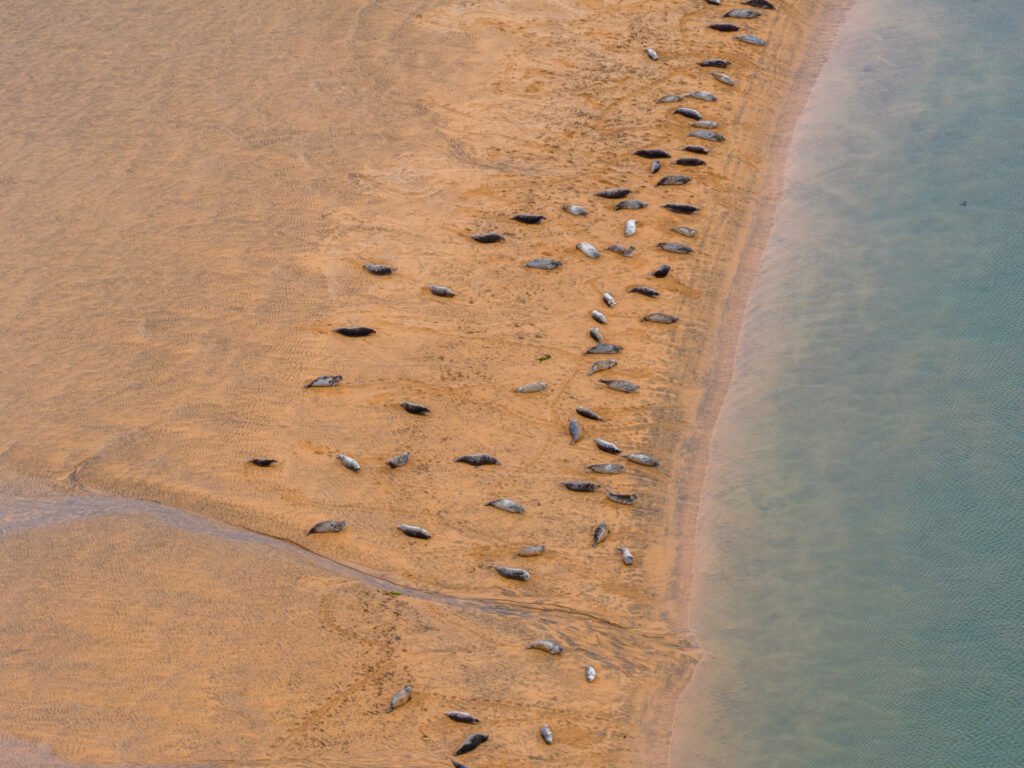 Nach dem Frühstück packen wir unsere sieben Sachen ins Auto und fahren über die endlose Schotterstraße zurück Richtung Zivilisation. Bevor wir diese erreichen, machen wir noch einen etwa 15-minütigen Umweg, um den großen, rötlichen Strand „Rauðasandur“ zu besuchen. Bereits bei der Anfahrt genießen wir einen großartigen Blick auf den Strand, der sich über etwa 10 Kilometer erstreckt. In der Mitte mündet ein Fluss bzw. eine Lagune ins Meer. Wir fahren sowohl zur rechten als auch zur linken Seite des Strandes, gehen beim dortigen Campingplatz ein paar Schritte und starten einen Drohnenflug. Aus der Luft entdecken wir auch die „Harbor Seals“, die am Campingplatz schon beschrieben waren. Der Wind ist heute jedoch ziemlich stark (etwa 40 km/h), und es spritzt immer wieder leicht – Karibikstimmung kommt daher nicht auf.
