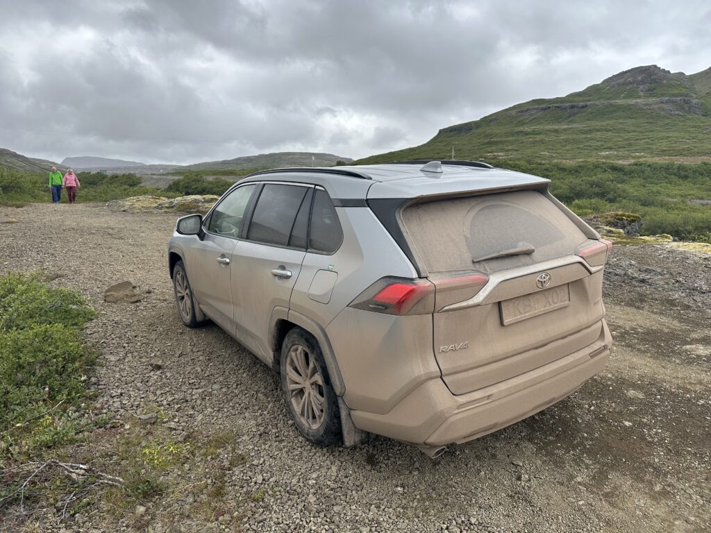 Etwas weiter, in Flókalundur, wo wir am Vortag getankt haben, gibt es bei der Tankstelle gratis Bürsten mit Wasser. Unser Auto war durch Regen und die schlammigen Schotterstraßen schon extrem verdreckt – die Fenster waren kaum mehr durchsichtig, die Spiegel unbrauchbar.