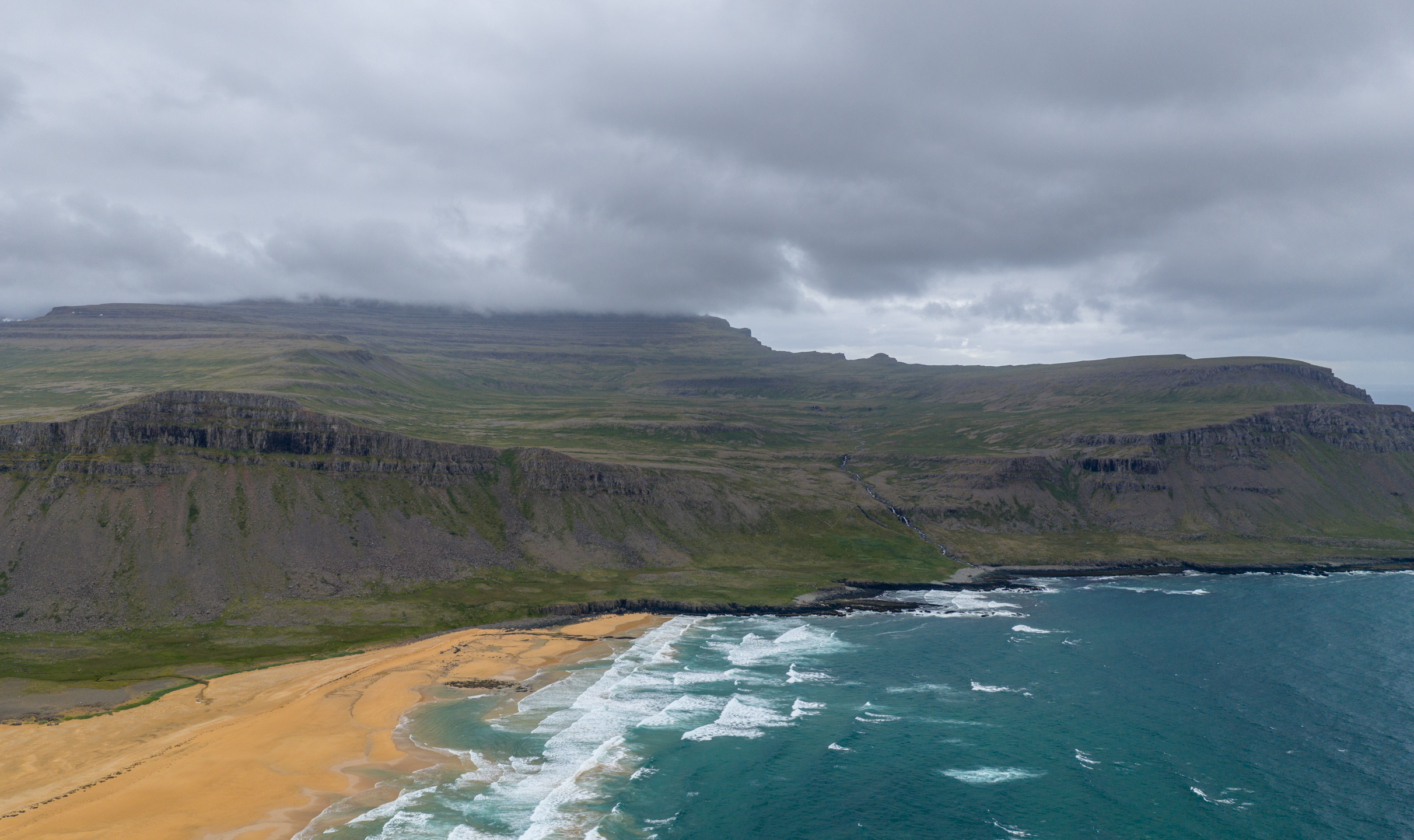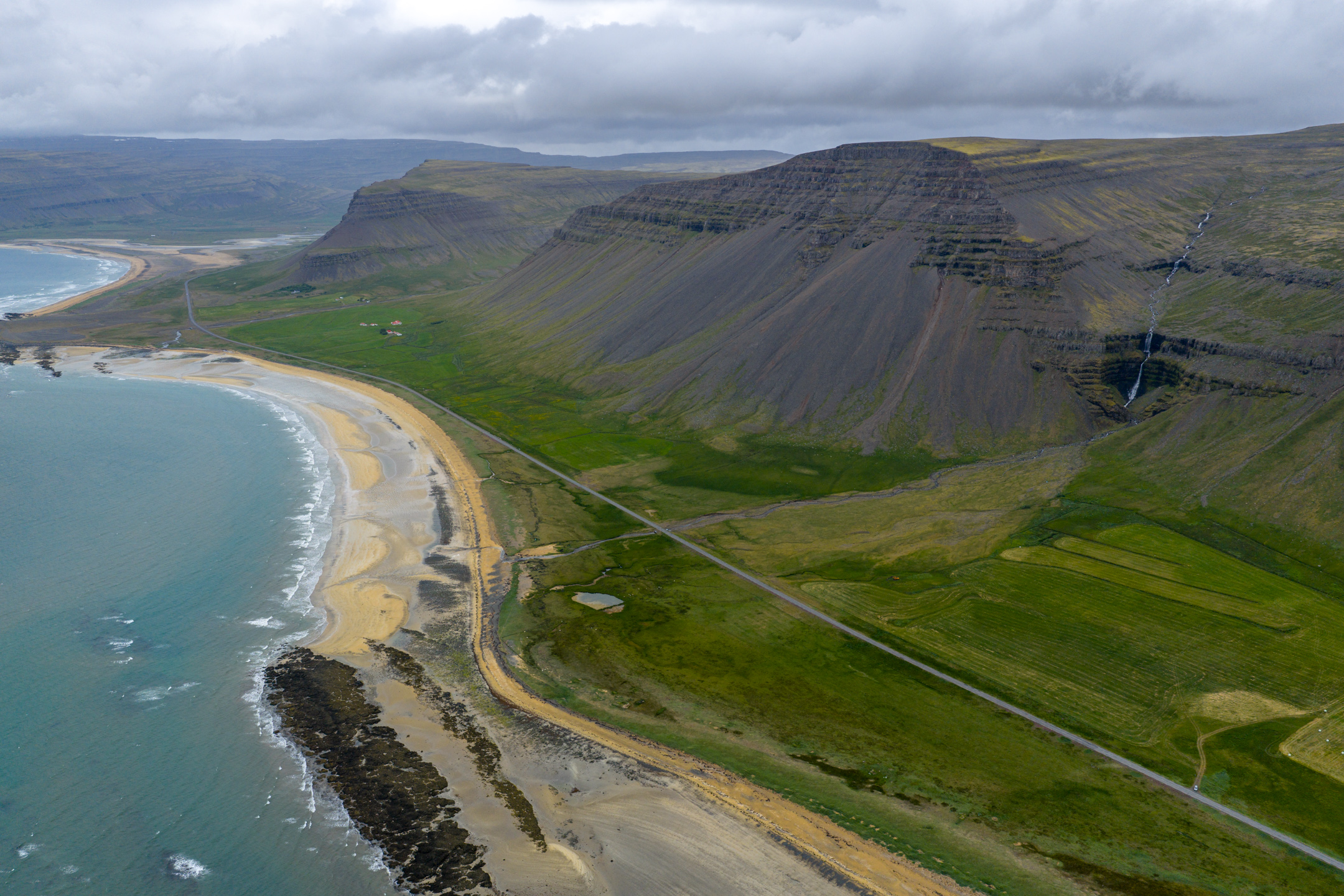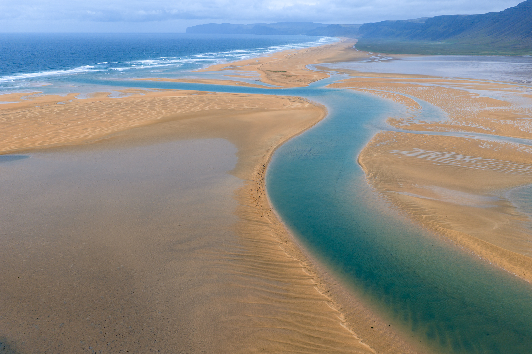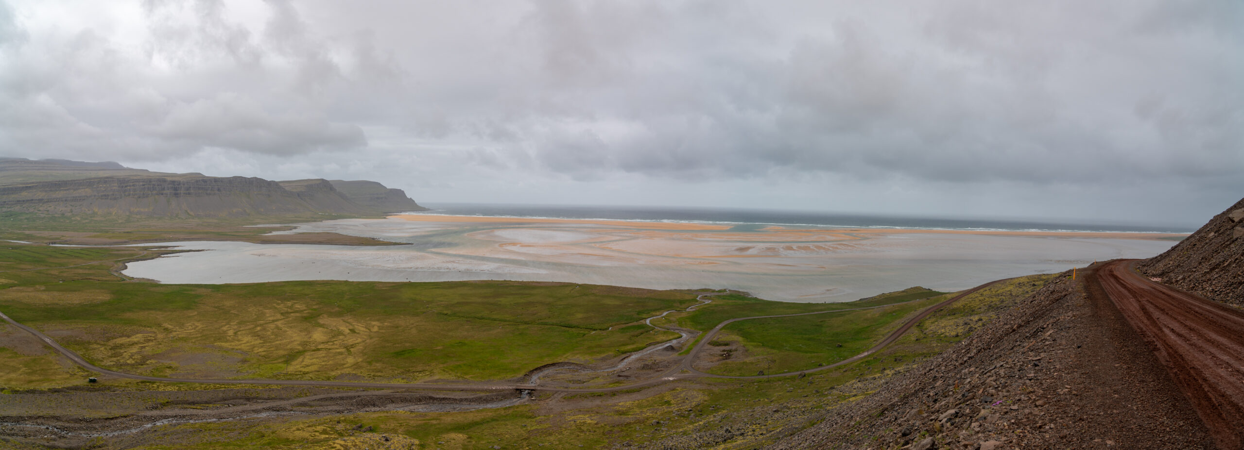 Nach dem Frühstück packen wir unsere sieben Sachen ins Auto und fahren über die endlose Schotterstraße zurück Richtung Zivilisation. Bevor wir diese erreichen, machen wir noch einen etwa 15-minütigen Umweg, um den großen, rötlichen Strand „Rauðasandur“ zu besuchen. Bereits bei der Anfahrt genießen wir einen großartigen Blick auf den Strand, der sich über etwa 10 Kilometer erstreckt. In der Mitte mündet ein Fluss bzw. eine Lagune ins Meer. Wir fahren sowohl zur rechten als auch zur linken Seite des Strandes, gehen beim dortigen Campingplatz ein paar Schritte und starten einen Drohnenflug. Aus der Luft entdecken wir auch die „Harbor Seals“, die am Campingplatz schon beschrieben waren. Der Wind ist heute jedoch ziemlich stark (etwa 40 km/h), und es spritzt immer wieder leicht – Karibikstimmung kommt daher nicht auf.
