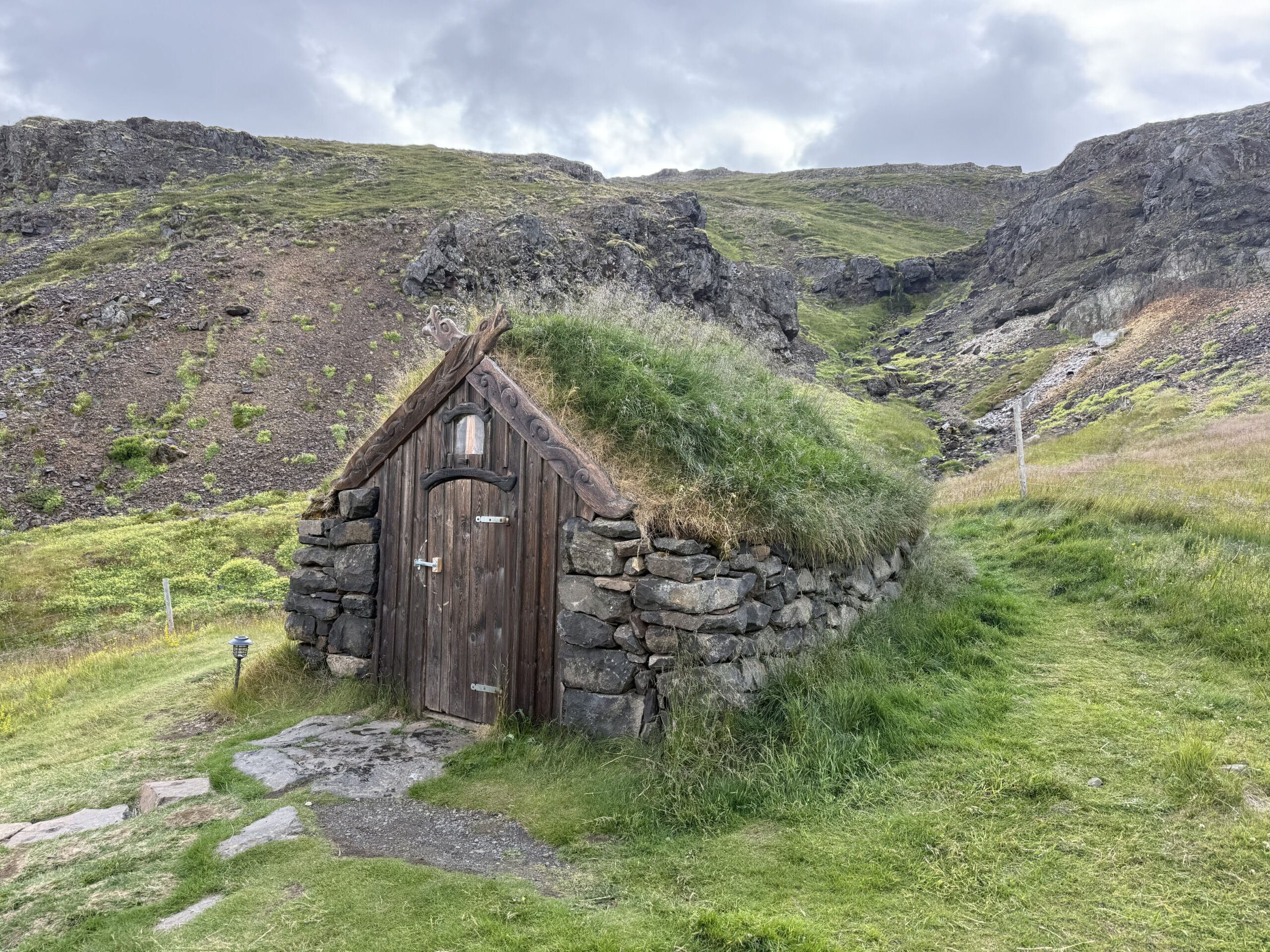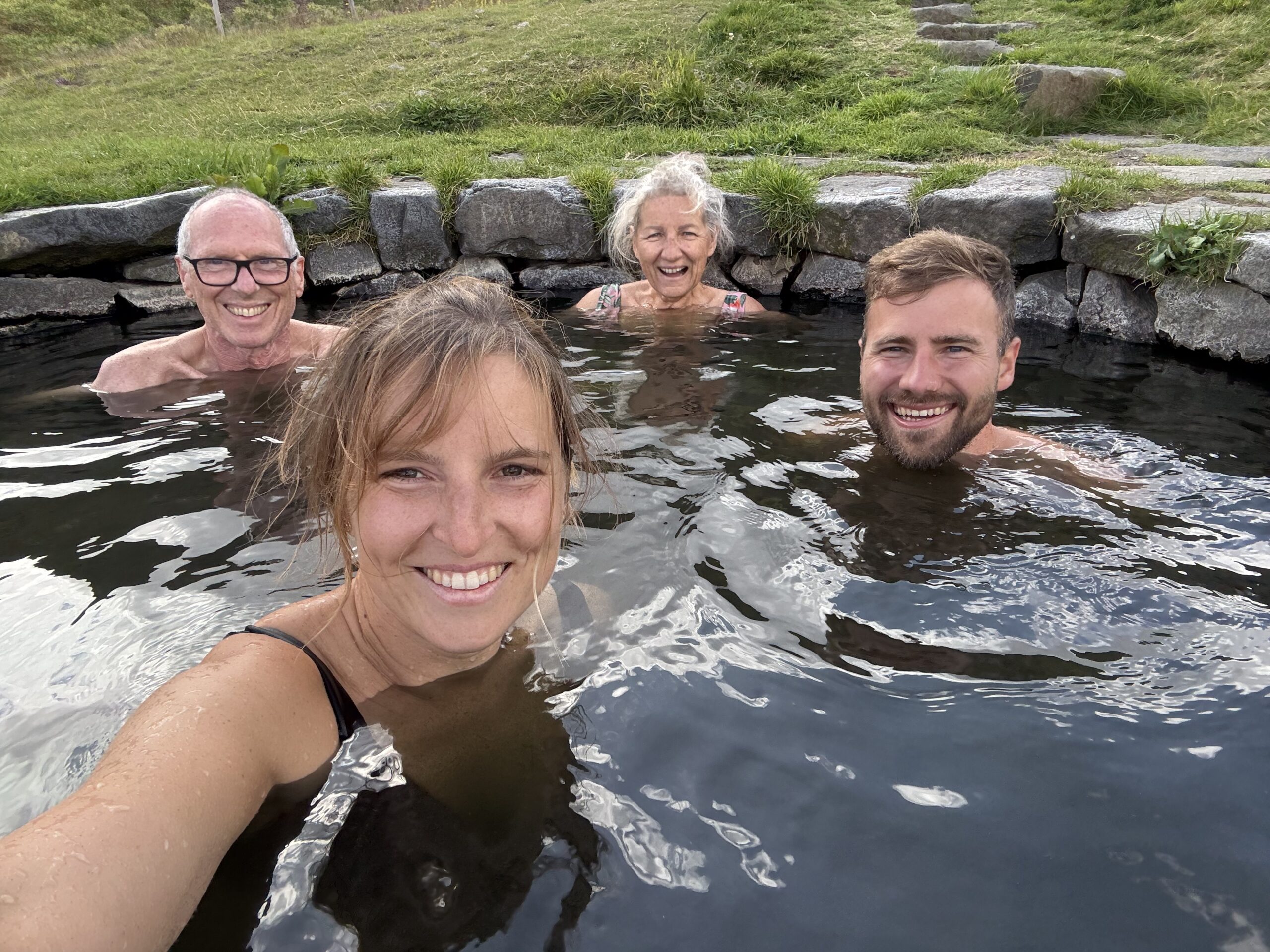 Die Fahrt führt uns weiter entlang der Küste, über Brücken und durch Fjorde. Das Wetter wird etwas freundlicher, aber der Wind bleibt. Wir stoppen bei einem Hotel nahe der Hauptstraße, neben dem sich ein öffentlicher Hot Pool befindet. Auch eine Wanderung wäre hier möglich, doch wegen der Temperaturen und des Windes entscheiden wir uns zunächst für den Hot Pool. Ein Schweizer Paar warnt uns bereits vor der geringen Wassertemperatur, doch wir lassen uns nicht abschrecken. In einer kleinen Wikingerhütte kann man sich umziehen, dann geht es in das mit Steinen ummauerte, leicht veralgte Becken. Tatsächlich ist das Wasser so kalt – geschätzt etwa 30 Grad –, dass man schneller auskühlt als aufwärmt. Wir bleiben dennoch alle kurz drinnen und bekommen noch Gesellschaft von zwei Finninnen, ehe wir uns rasch abtrocknen – was uns gleich noch kälter macht.