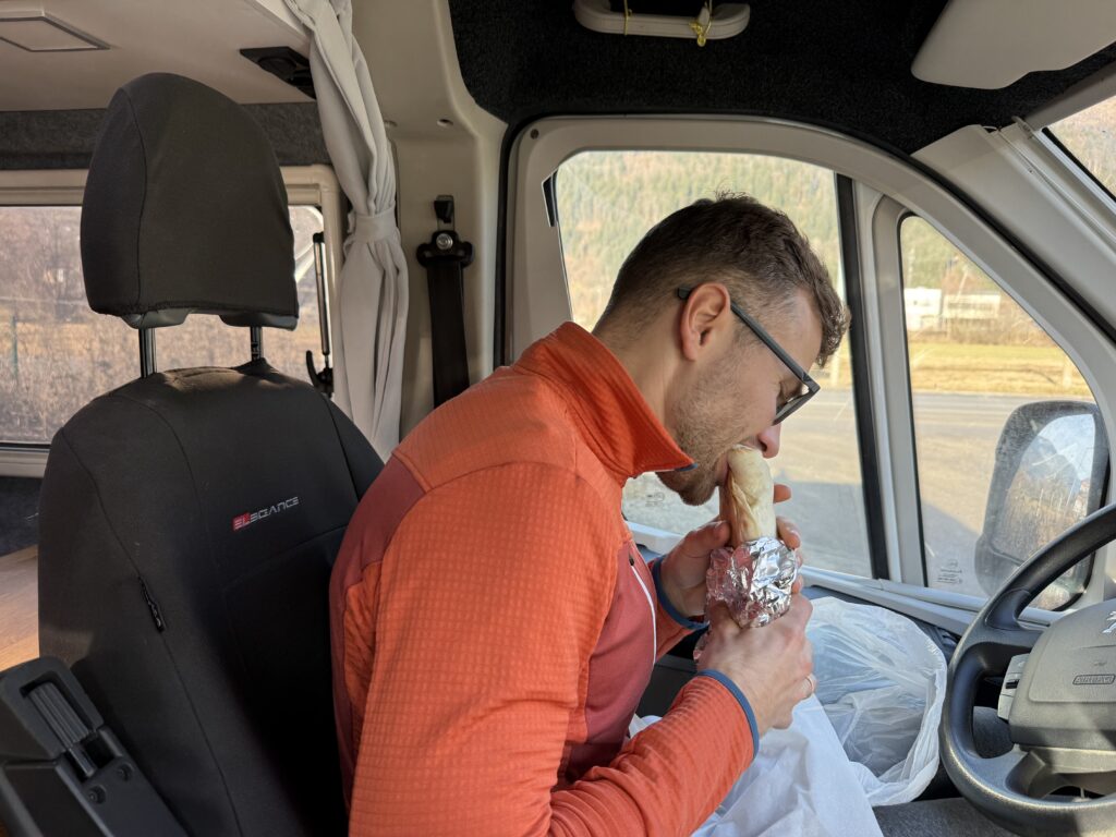 Lukas holt dankenswerterweise die neue Batterie beim Forstinger und baut sie wieder ein. Der Bus startet einwandfrei an. Nur noch gemütlich einen Kaffee trinken, dann rollen wir mit den letzten Tropfen Diesel zur Tankstelle. Zweiter Test: ja, auch die Standheizung funktioniert nun. Juhuu. Was kann jetzt noch schiefgehen? Wir wollen es rausfinden und starten erneut Richtung Norden. Wieder raus aus dem Nebel, der aber bis fast nach Liezen über uns hängst. Dort bekommen wir Hunger und beseitigen diesen gleich wieder.