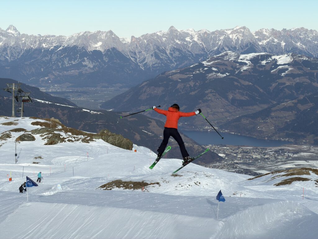Wir steigen in die Gondel, und dann noch in ein paar weitere Lifte – es dauert bis wir tatsächlich mal auf den Brettern stehen. Doch die Aussicht ist überwältigend. Und die Hänge haben wirklich eine geniale Steigung fürs Snowboarden – hab natürlich ein bisschen FOMO, komme auf meinen genialen Ski aber ohnehin voll auf meine Kosten.