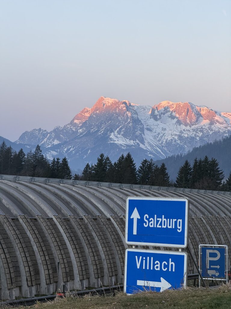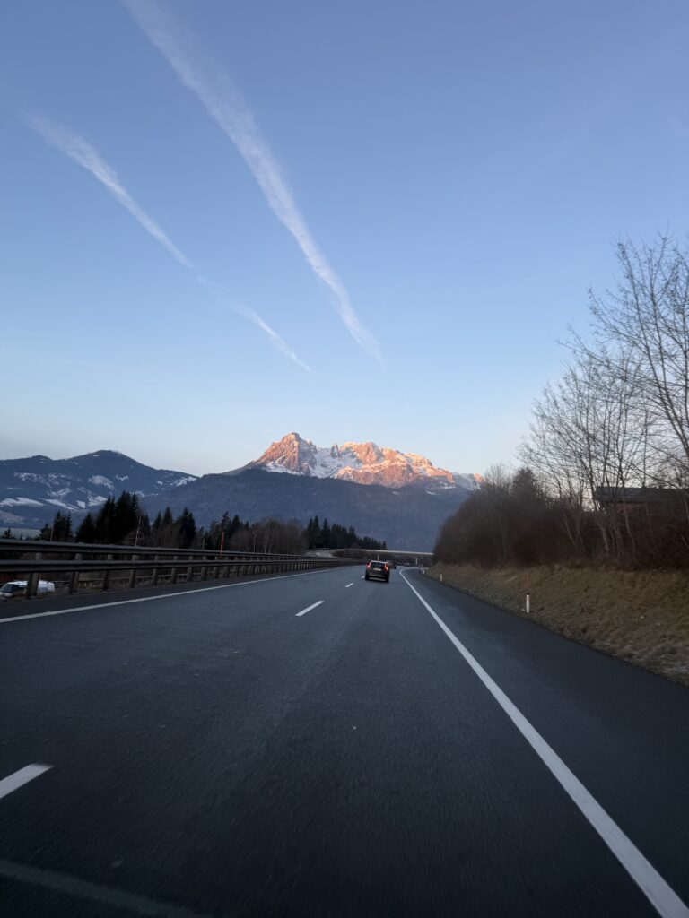 Wir wachen eher spät, aber gechillt ohne Wecker am Parkplatz auf und Jucheeee, das Auto startet und wir dürfen bei schönstem Wetter die Sonne über der Bergwelt aufgehen sehen. Heute früh geht es also tatsächlich, wie eigentlich für vor 2 Tagen geplant, ins hoch gelegene Skigebiet Kitzsteinhorn. Schon unten fällt Lukas die Menge an Snowboardern auf – vielversprechend. Ich nehm trotzdem mal die Ski – falls es eisig ist bei so wenig Schneemenge möchte ich mir nicht beim Snowboarden weh tun, lieber auf Nummer sicher gehen.