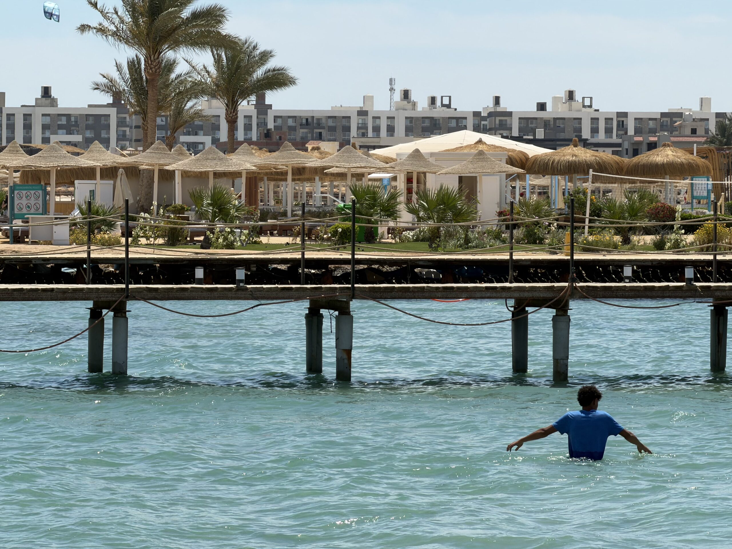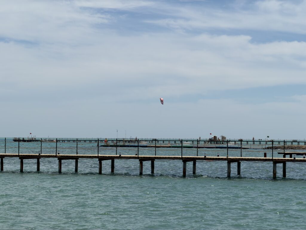 Aufgrund der Zeitverschiebung und unserem Schlafrhythmus sind wir heute eben auch etwas später erst am Kite-Spot. Die Windvorhersage ist für heute sowieso ziemlich gering, wir haben keine großen Erwartungen. Eva startet nichtsdestotrotz mit dem 11er Kite und dem Foil. Mit dem großen, wenig wendigen Schirm ist das ein komplett neues Erlebnis und man muss wieder neu lernen. Der Wind ist aber so schwach, dass es ziemlich fatal wird, wenn ihr der Schirm ins Wasser fällt. Ohne Stand im seichten Wasser bekommt man nicht genug Druck rein um ihn wieder aus dem Wasser starten zu können. Und beim Erlernen neuer Dinge und dem leichten Wind ist die Wahrscheinlichkeit umso höher, dass man den Schirm versenkt. So dauert es nicht lange, bis sie beinahe außer Sichtweite zwei Strände weiter in Schwierigkeiten gerät. Die zwei Angestellten vom Kite-Spot beobachten mit mir das Geschehen. Wir sind nicht ganz sicher, ob sie es wieder schaffen würde zurück zu kommen und so startet einer der Angestellten direkt in ihre Richtung. Dabei muss er aber brusttief durch zwei Marina Eingänge gehen. Bevor er jedoch bei Eva ankommt, hat diese es nach mehreren Versuchen wieder geschafft zu starten und kreuzt bereits am Foil wieder zurück zu unserem Strand. Das Spektakel dauerte aber lang genug um mir einen leichten Sonnenbrand am nicht eingeschmierten Dekoltee zu bescheren.