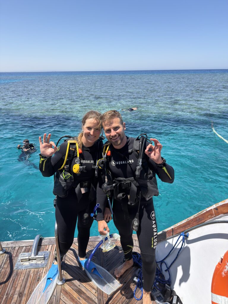 Gestartet wird aus einem anderen Surise Hotel etwas zentraler in Hurghada. An Land bekommen wir unsere Ausrüstung. Die Medical Untersuchung interessiert hier klassisch niemanden, der Fragebogen reicht (zum Glück, denn wir haben beide keine aktuelle). Wir bauen alles zusammen. Ich stelle traurig fest, dass ich erfolgreich meinen Tauchcomputer im Hotel vergessen hab (nachdem ich ihn schon zuhause ewig gesucht hatte – wohl umsonst).