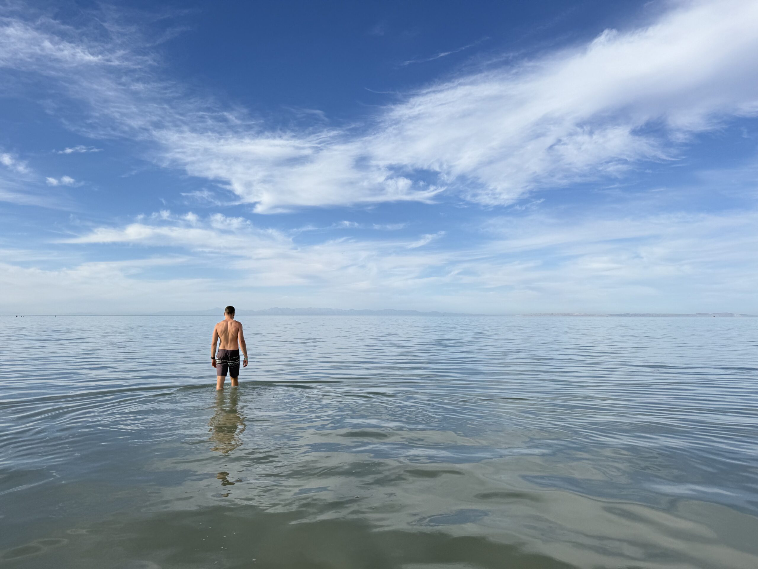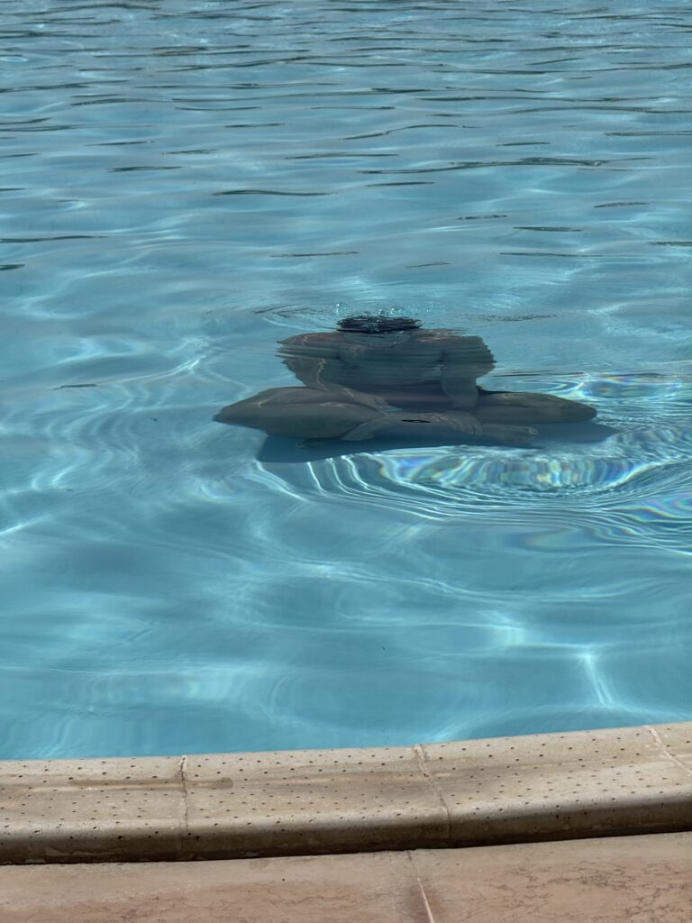 Lukas überrede ich noch, meine Unterwasser-Kopfhörer zu testen und auch er findet es magisch. Allerdings nicht lange, denn das Wasser im Pool, das wir erstmals betreten, ist recht erfrischend (23°) im Vergleich zur Außtentemperatur.