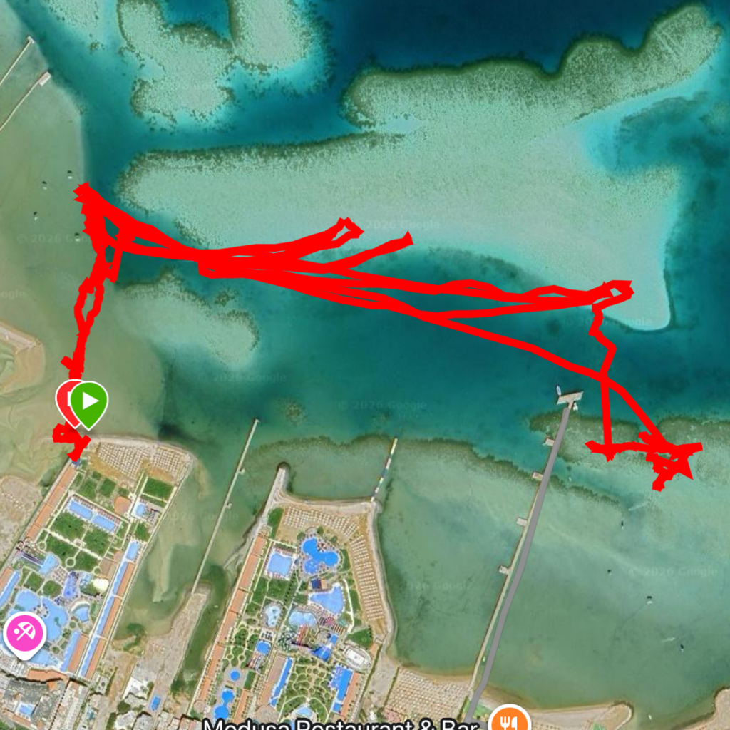 Eva’s Sicht der Dinge: der 11er Schirm verhält sich komplett anders als der 7er, da er so mega träge ist, wenn er aber dann in Bewegung kommt ordentlich zieht und mich schnell vom Brett haut. Man muss also ziemlich antizipieren was in 3-4sec nötig sein wird. Das dauert um reinzukommen. Alle Faktoren einberechnend, komme ich dann aber ein bissl rein wieder und komme auch ins Fahren. Allerdings haut es mich kurz nach dem Start am fernsten Punkt von der Kiteschule ins Wasser und den Schirm gleich mit. Das Brett ist nicht mehr in Reichweite. Schirmstart im tiefen Wasser ist komplett chancenlos, was mach ich jetzt? Von einem Rescue Service war bei der Kiteschule nicht die Rede, Boot haben sie ja auch keines, so beobachte ich nur, ob sich doch irgendwo ein Boot in Bewegung setzt. Ich versuche zu sehen, wo die südlichere Kiteschule ihren Strand hab und lasse mich mit dem Wind in diese Richtung ziehen und befürchte dass mein Brett aber auf die anderen Seite des Steges getrieben wird. Es dauert eine Weile, bis ich am Riff ankomme, dieses ist zum Glück tief genug, dass ich mich gerade drüber ziehen lassen kann. In einem Sandbereich, wo ich stehen kann, versuche ich dann nochmal den Schirm zu starten und mit etwas Geduld glückt es. Und ich habe nochmehr Glück – das Brett treibt doch genau auf mich zu. Ich wittere nochmal eine Chance in einer schmalen Schneise zwischen den Korallen nochmal zu starten – leider ist der Start nach rechts meine schwache Seite. Beim ersten Versuch bin ich viel zu zögerlich, ich komme nicht ins Fahren, es zieht mich nur erneut ins Riff. Auf dem Weg zurück zum Startpunkt fällt mir der Schirm erneut ins Wasser und es braucht wieder, diesmal mit einem „russischen Start“. Diesmal denke ich mir, letzter Versuch, alles oder nichts, also volles Commitment. Und es glückt tatsächlich.