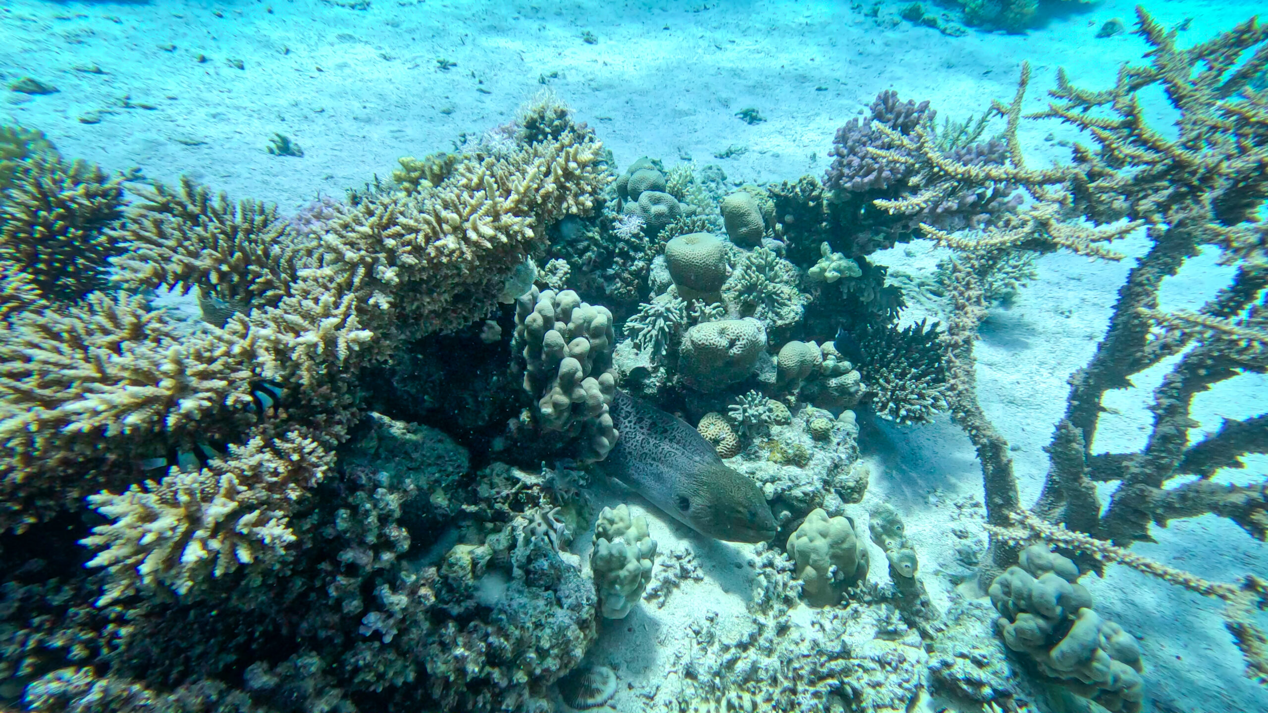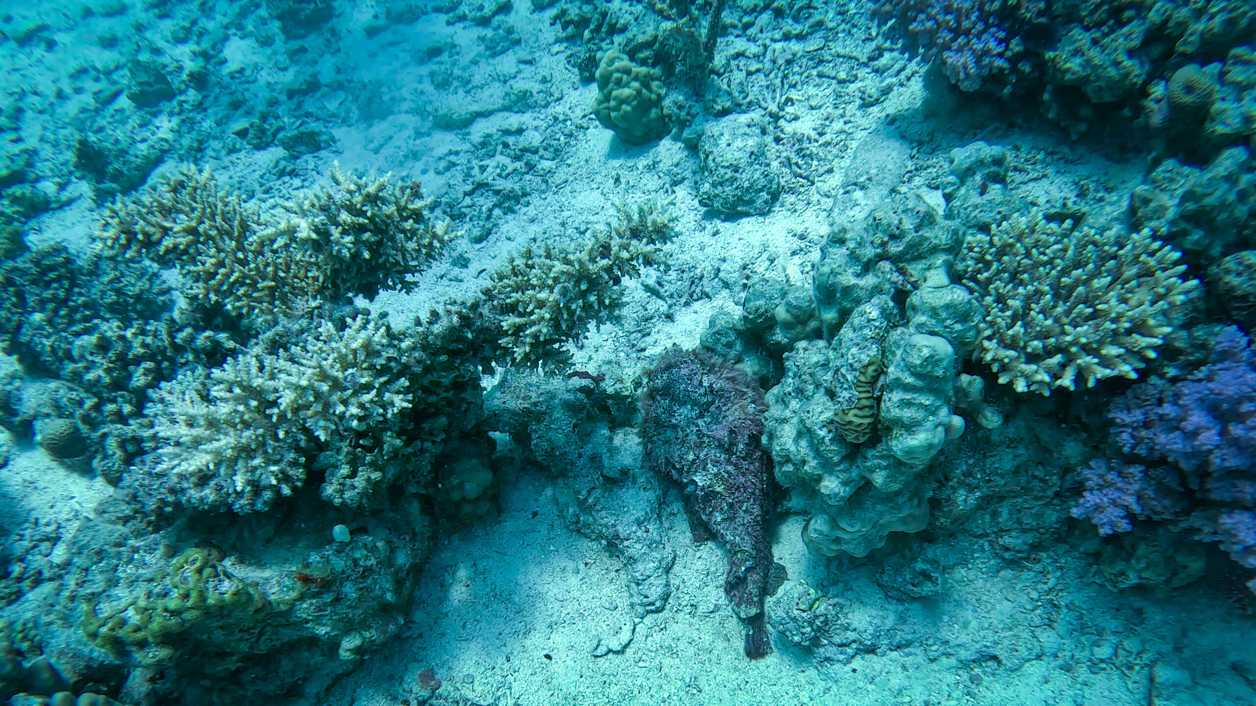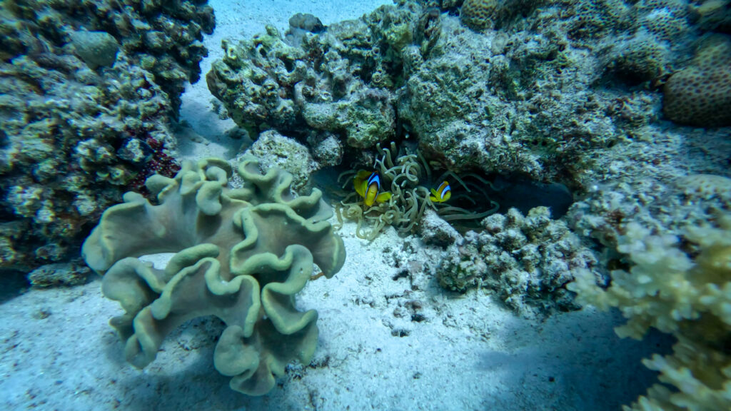 In einer kurzen Pause, die leider nicht wirklich zum wieder Aufwärmen reicht, unterhalten wir uns mit unserem netten, lustigen Tauchguide Islam und dem Multikulti-Spanier. Mit letzterem auf Deutsch – er hat auch lange in München gelebt. So vergeht die Zeit schnell und bald tauchen wir ein zweites Mal ab. Eine erstaunlich große, versteckte Muräne und eine schlangenartig gestreifte zarte Muräne, die über den Meeresboden schlängelt, bleiben uns besonders in Erinnerung. Außerdem sehen wir eine Clownfisch-Familie in allen Größen inklusive dem kleinsten Nemo, den ich je gesehen habe. Auch sehen wir einen Blaupunktrochen und einen weiteren, aber kleineren Steinfisch. Ich entdecke auch eine Scholle, die sich kaum vom Sand abhebt.