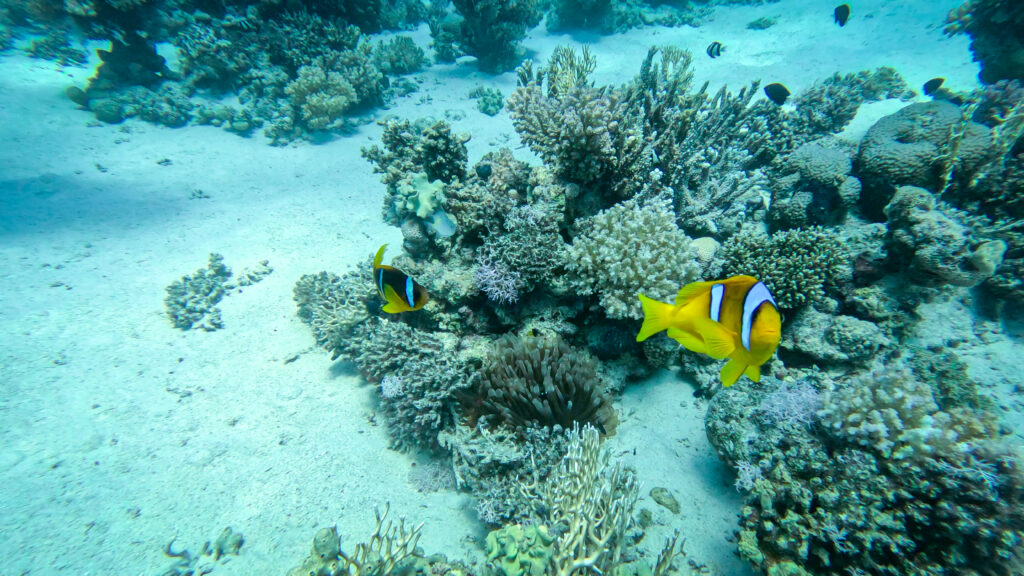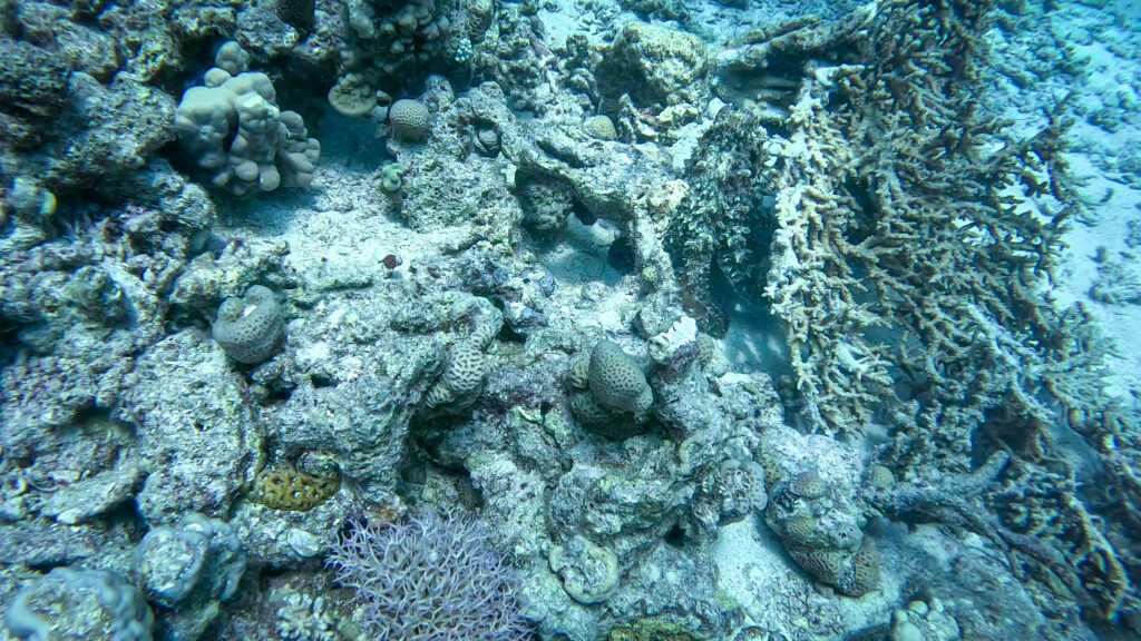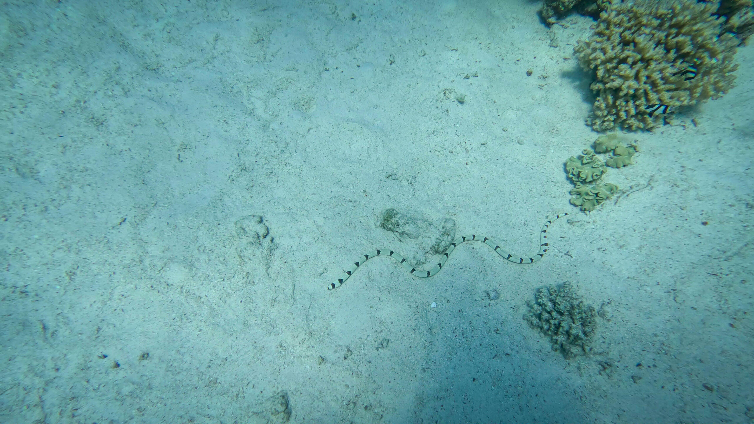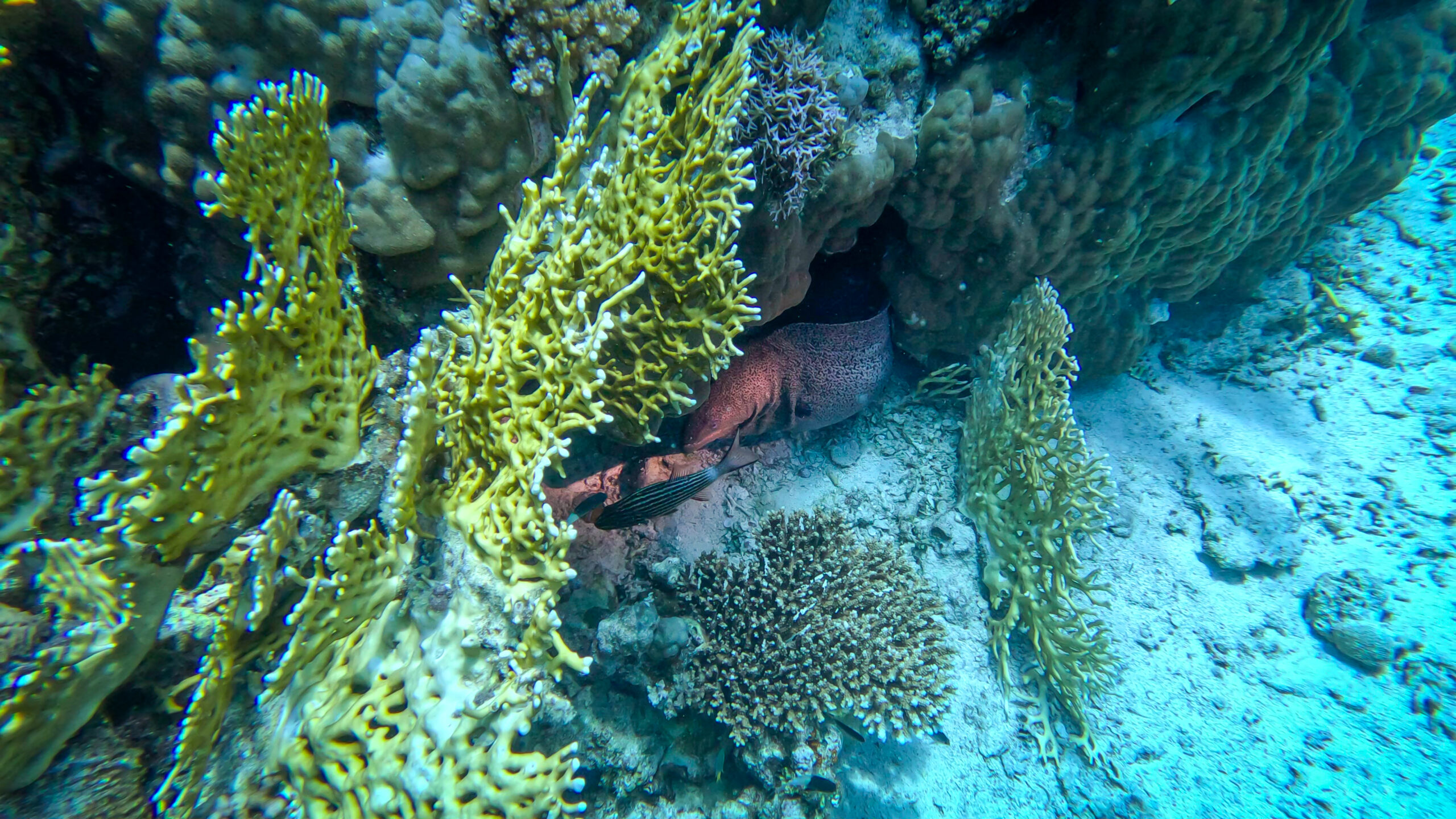 In einer kurzen Pause, die leider nicht wirklich zum wieder Aufwärmen reicht, unterhalten wir uns mit unserem netten, lustigen Tauchguide Islam und dem Multikulti-Spanier. Mit letzterem auf Deutsch – er hat auch lange in München gelebt. So vergeht die Zeit schnell und bald tauchen wir ein zweites Mal ab. Eine erstaunlich große, versteckte Muräne und eine schlangenartig gestreifte zarte Muräne, die über den Meeresboden schlängelt, bleiben uns besonders in Erinnerung. Außerdem sehen wir eine Clownfisch-Familie in allen Größen inklusive dem kleinsten Nemo, den ich je gesehen habe. Auch sehen wir einen Blaupunktrochen und einen weiteren, aber kleineren Steinfisch. Ich entdecke auch eine Scholle, die sich kaum vom Sand abhebt.