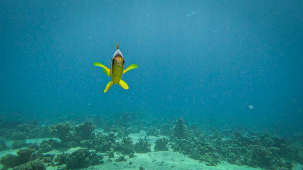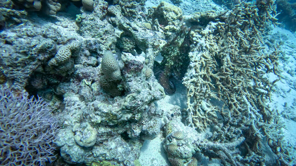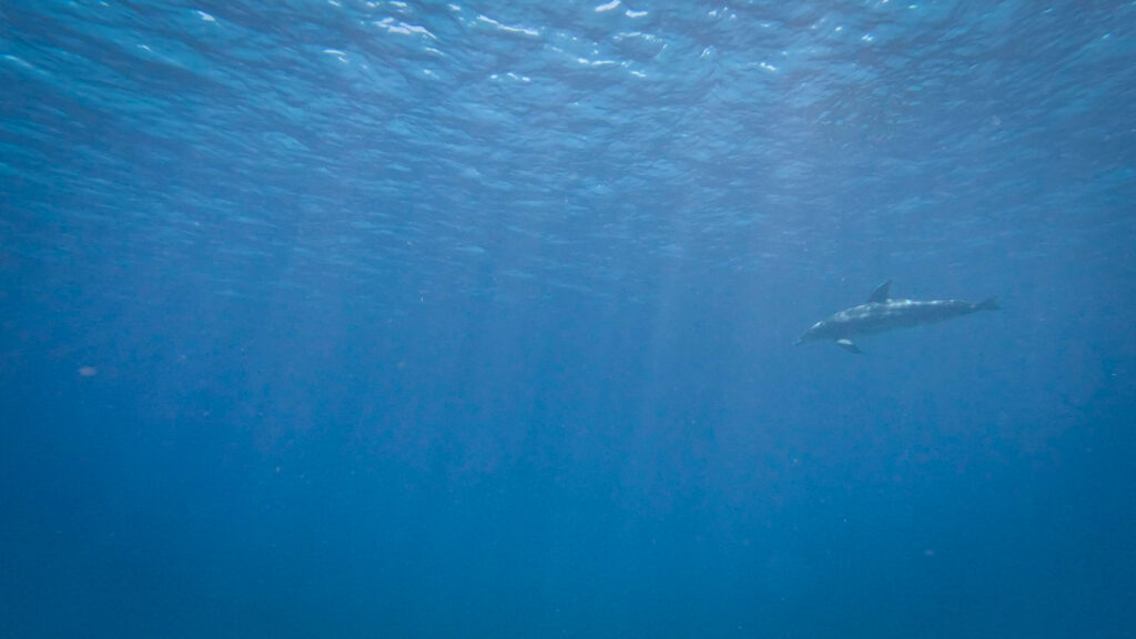 Es wird ein toller Tauchgang – Muräne, ein spannender Mundputzer-Fisch den wir nicht in Anspruch nahmen, sondern nur unser Tauchguide. Ein großer Steinfisch. Gegen Ende entdeckt Lukas einen vergleichsweise großen Oktopus und zum Abschluss schwimmt tatsächlich noch ein Delphin an uns vorbei. Was für eine Einstimmung. Dass ein paar Sekunden darauf ein Schnellboot den Delphin jagt und 4-5 Schnorchler direkt daneben ins Wasser springen und den Meeressäuger verfolgen, verstört die entspannte Unterwasser-Stimmung etwas. Den Delfin vertreibt es jedenfalls auch sofort. Gänzlich respektlos der Natur gegenüber.